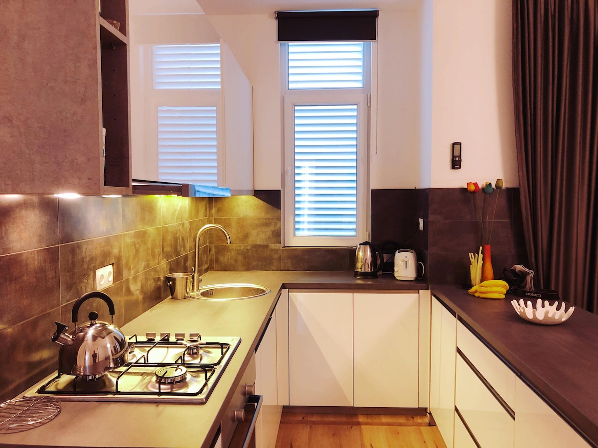 The one-bedroom apartment is a three-minute walk from Freedom Square and a stroll away from everywhere you would want to go: all the sightseeing sites, hidden gems, the trendiest restaurants, and bars, botanical garden, parks, and museums. Although at the heart of the Old Town bustle, the apartment has an entrance from a secluded street, maintaining a relative calm.