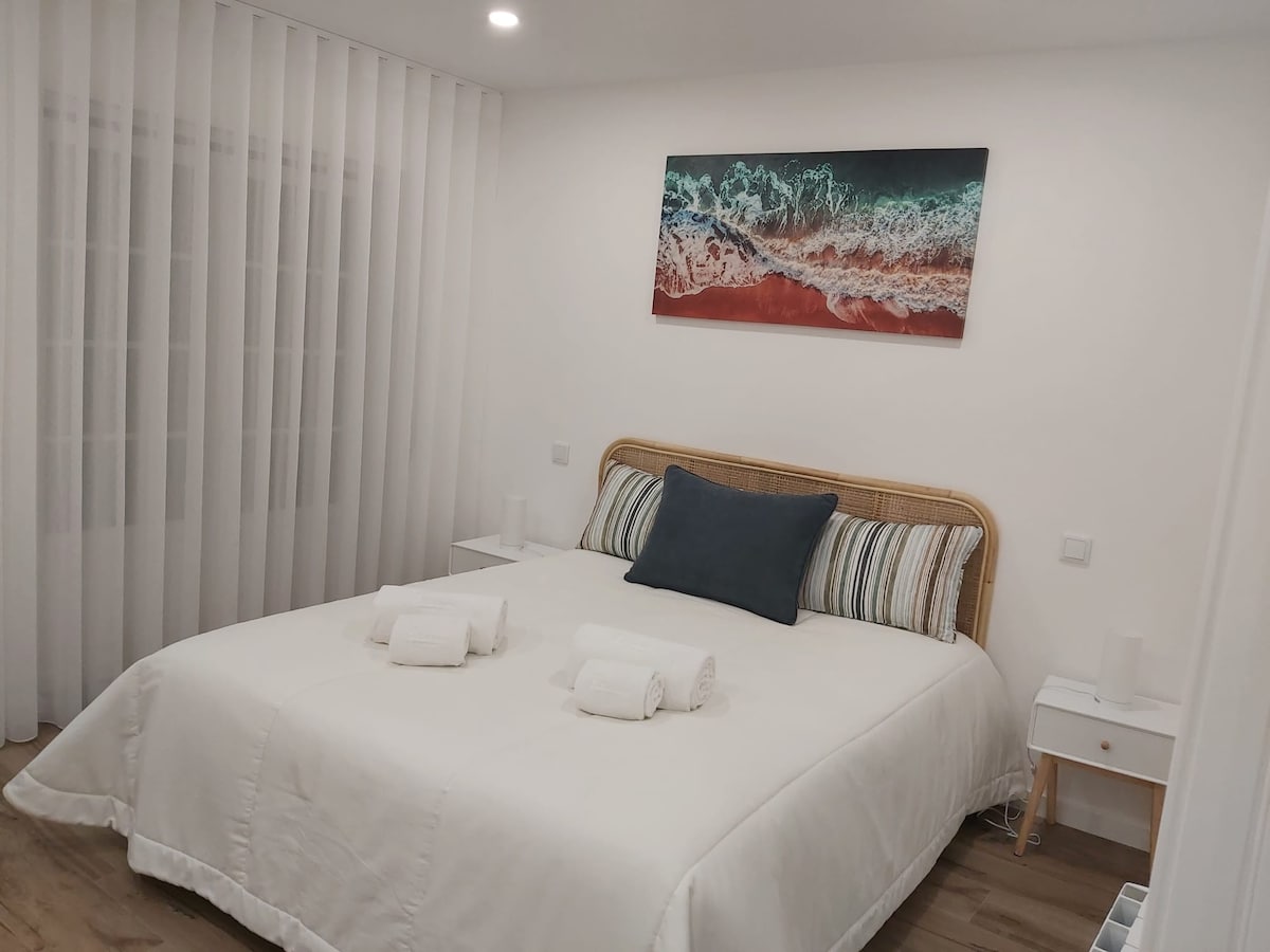 A newly renovated modern-coastal style Two bedroom apartment with spectacular views over the Atlantic Ocean and picturesque Nazaré Village and its hills, located in Sitio, a stone throw away from the Big Wave Lookout as well as Nazaré village and its beaches, whether watching the sun rise with a coffee, or the sun set with a glass of wine on the balcony you will be mesmerised by your surroundings. The apartment is perfect for couples and families on holiday, remote workers, long stays