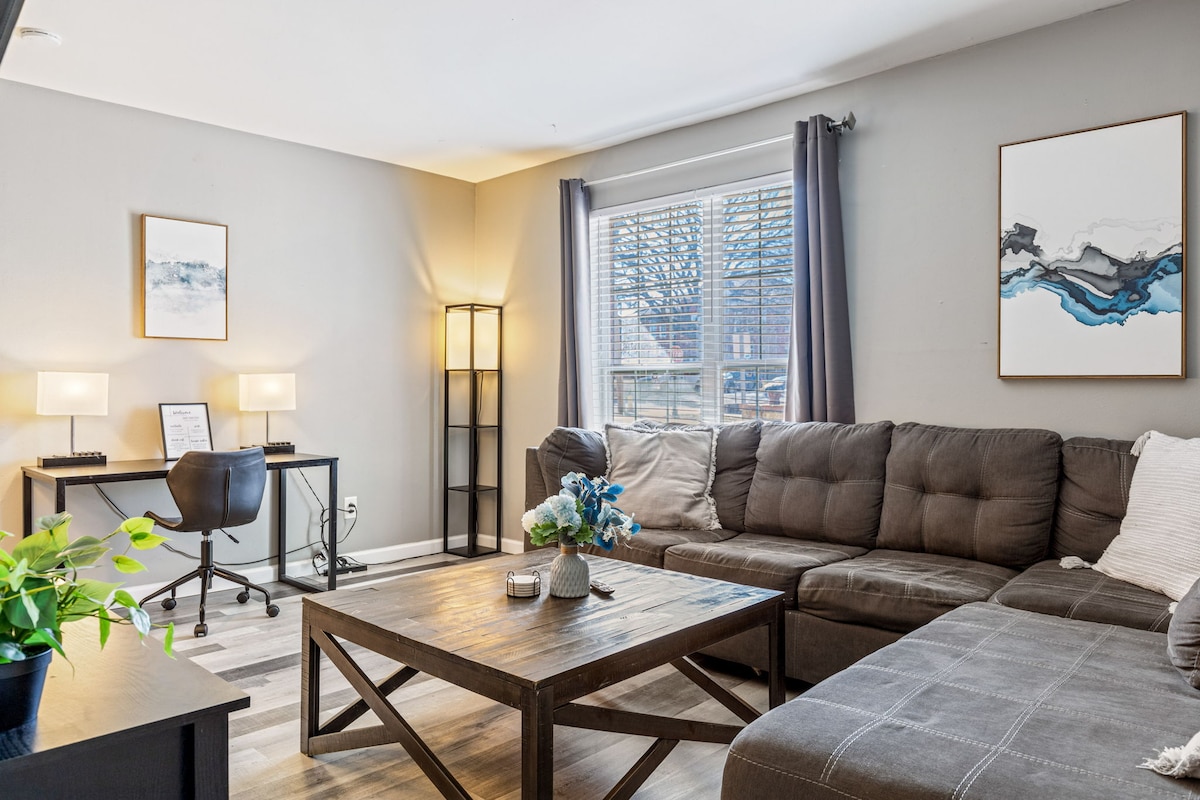 This comfy 2 bedroom, 1.5 bath townhome is perfect for up to 5 guests. Luxury King bed in bedroom 1 and luxury Queen bed in bedroom 2. A futon in the living room can be used for a 5th guest. A pack-n-play is available upon request. This dynamic location is 5 minutes from bars, restaurants, shopping, Lindenwood University, and Ameristar Casino. It's only 2 miles from St. Charles, historic, Main Street, and it's only 15 minutes from the airport, and about 30 minutes from downtown St. Louis.