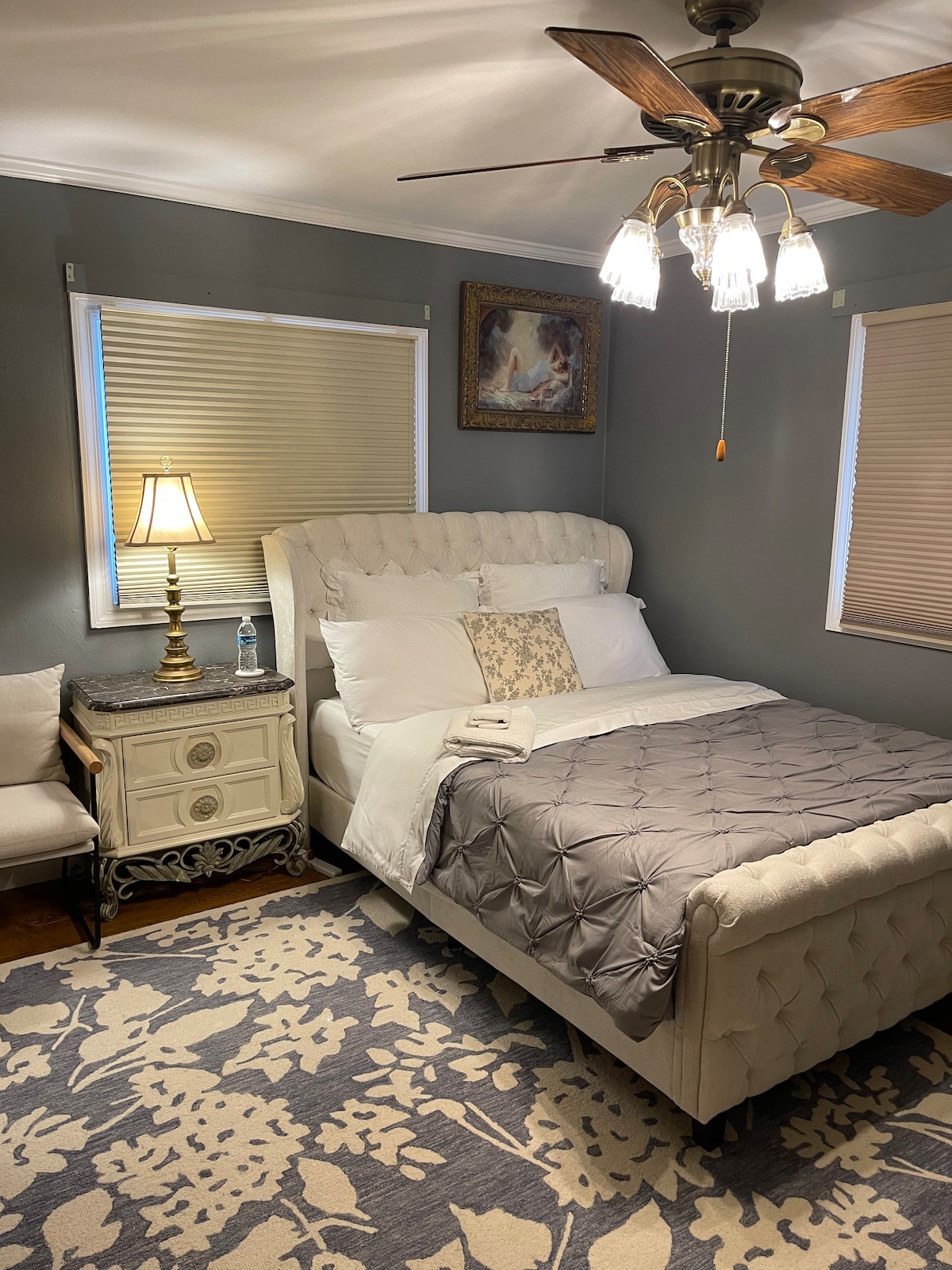 Welcome to Pop Luck's Guest Suite! This adorable gem represents everything you love about Old St. Charles. This cozy suite is just steps away from the heart of Main Street, restaurants, and all the action St. Charles has to offer. Pop Luck's is a charming one-bedroom, with an open and airy living room and kitchen. It has natural light and high ceilings throughout. It's farmhouse cottage decor makes for a relaxing place to rest. Also, check out our sister suite The Ella Rose, right next door.