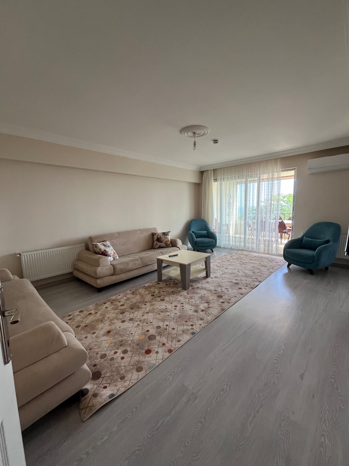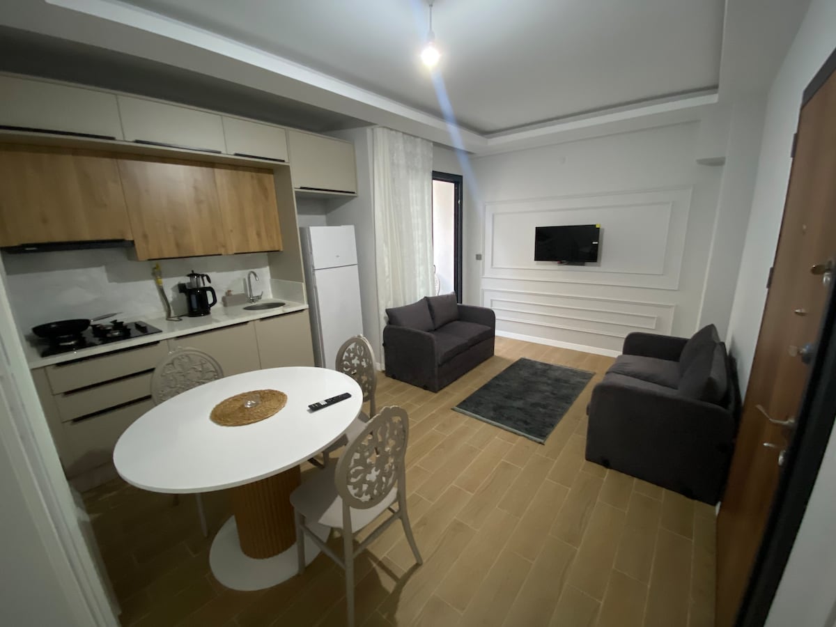 Sahile,plaja ve şehir merkezine 5 dk mesafededir.Havaalanına araçla 25 dk .Market restoran ve kafelere yürüme mesafesindedir.Binanın önünde Dolmuş durağı bulunmaktadır Ayrıca girişte giyim mağazası olup müşteriye özel ücretsiz otoparkı mevcuttur.Modern mobilyalı ve tam donanımlıdır.Her odada klima ve sineklik mevcuttur.Tüm odalarda kalorifer sistemi ısıtma mevcuttur ve 24 saat sıcak su mevcuttur Odalar geniş ve ferahtır.Tüm mutfak araç gereçleri mevcuttur.Dairedeki tüm eşyalar yenidir