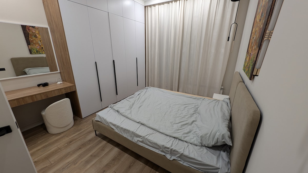 A bright but compact apartment with a fresh bedroom, a large bed and a soft sofa. We provide bed linen for each guest, as well as towels and disposable shampoos and soaps. Please treat our home with respect. The kitchen has all the necessary utensils for cooking, and the bathroom has a washing machine. Welcome!