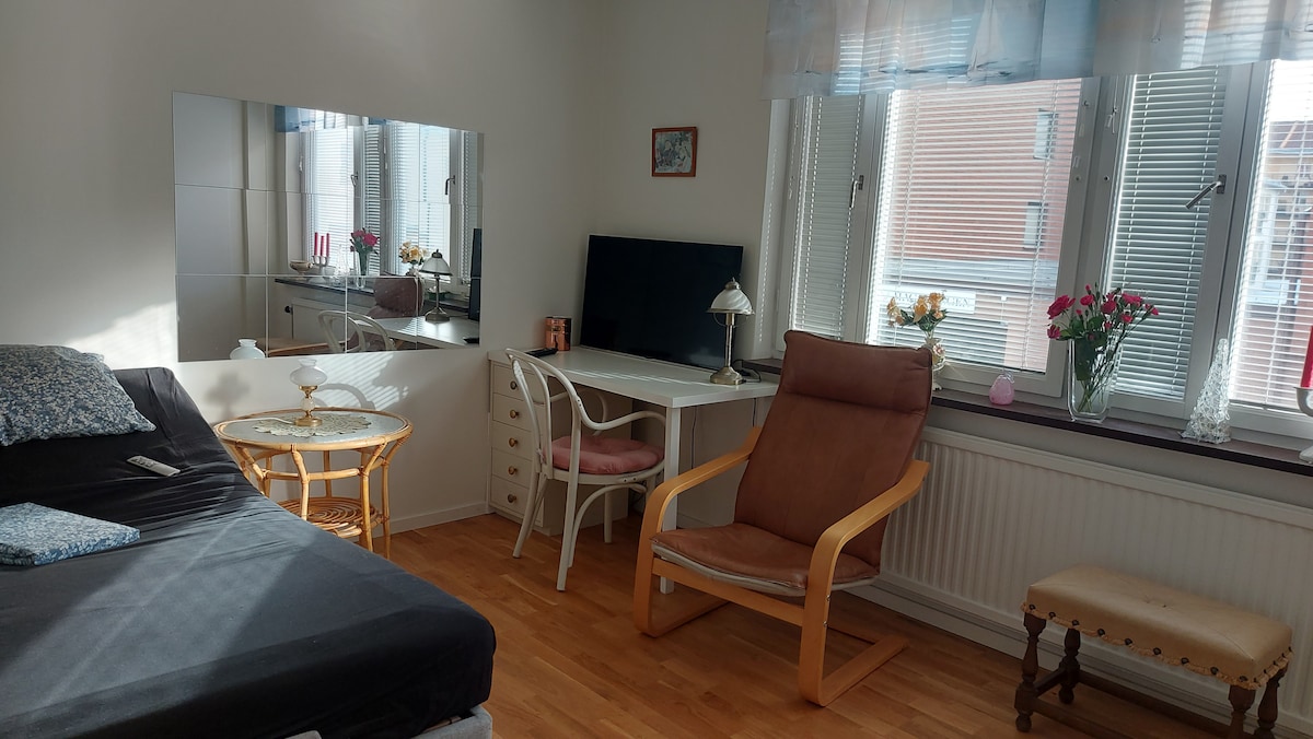 Three windows channel sunlight into our handsomely decorated 28m2 studio apartment in the basement of our lovely historic home. We are located only a 10-15 minute walk (800 meters) west of Örebro's central bus/train station. A private entrance and many amenities are designed to help you feel relaxed and secure. Some of these include fast wifi, kitchenette, refrigerator, microwave, TV, & basic cooking equipment… as well as free bicycles to help you explore beautiful Örebro.