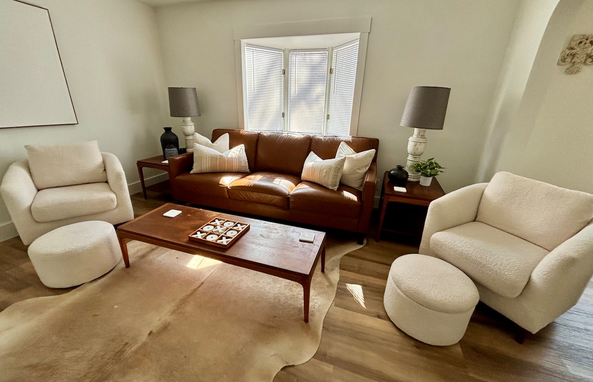 Nana & Grandpa's Mid-Mod dream home was built in 1955. Recently redone w/attention to maintaining the original charm, featuring an open concept w/ lg rooms, full kitchen, 2 patios, a fire pit, outdoor dining, & festive lighting for fun! Nana's is a safe, spacious, ‘cheery home'. Stroll past Historic homes to Downtown. Dining, Bars, Shops, Parks, Trails, Sports & Music, & business venues within minutes. 2 groceries, drug stores, big box, and medical within a 1-3 miles. Area quiet, safe.