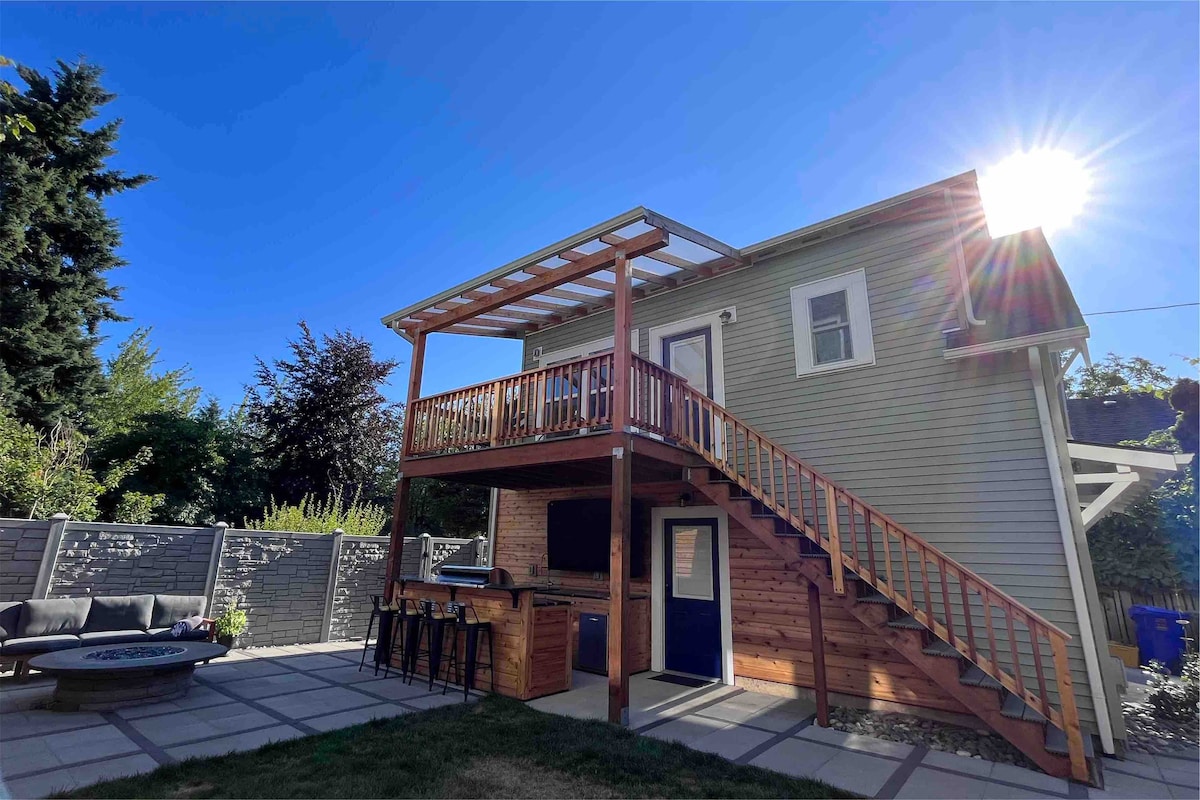 Our large (1,500sq ft) space (private access), has a bedroom, bathroom, living room w/ a fireplace, hot tub, full gym as well as a kitchenette w/ full sized fridge, keurig, microwave, air fryer, toaster oven, single burner, and laundry facility. Smart tvs, hammocks and a rooftop firepit are in the outdoor entertainment area. LGBT & BIPOC friendly. Gym, hot tub and laundry are shared with owners but guests have priority access. Close to Mt Hood Wilderness (45mins) & Downtown Portland (15mins).