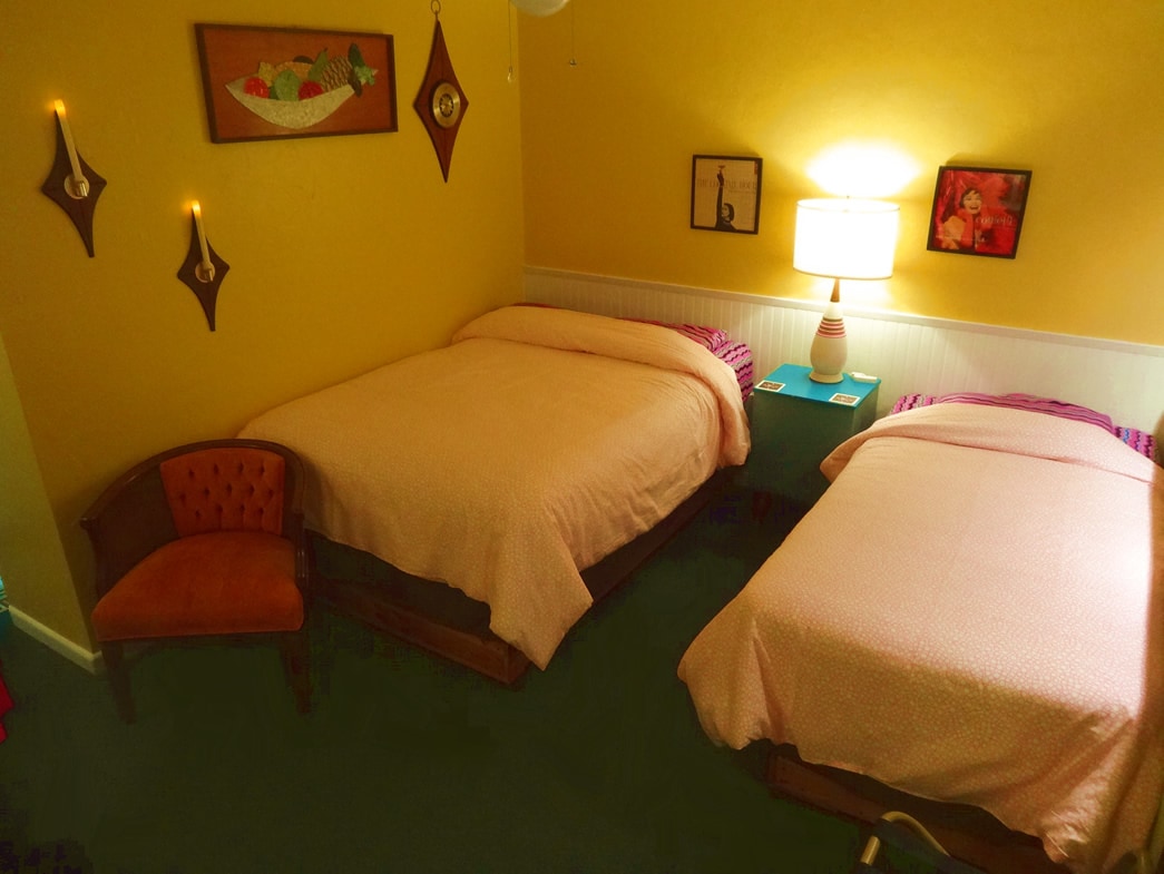 Measuring in at at 300 square feet, our Queen rooms offer plenty of space for two, appointed generously with a minifridge, microwave, coffee maker and large flatscreen TV. A desk and office chair provide a work area with lots of plug ins for your electronics. For a more vintage entertainment experience, fire up your room's retro record player. And, as you turn in for the night, let your 50s-era "Sleep Mate" lull you to sleep with it's legendary white noise.