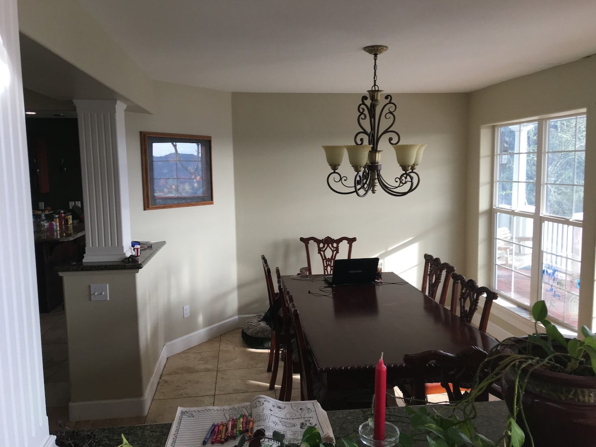 Awesome private property with madrone forest behind it, then incredible night and daytime views of the valley and city of Roseburg below in the front. This house currently has 7 bedrooms and 6 bathrooms that we are providing 3 bedrooms each with their own private bathrooms to our airbnb business. The Upper Forest View bedroom unit is a bit smaller with queen bed and private access to large bathroom/shower which also services the upper living room and private bar for guests.