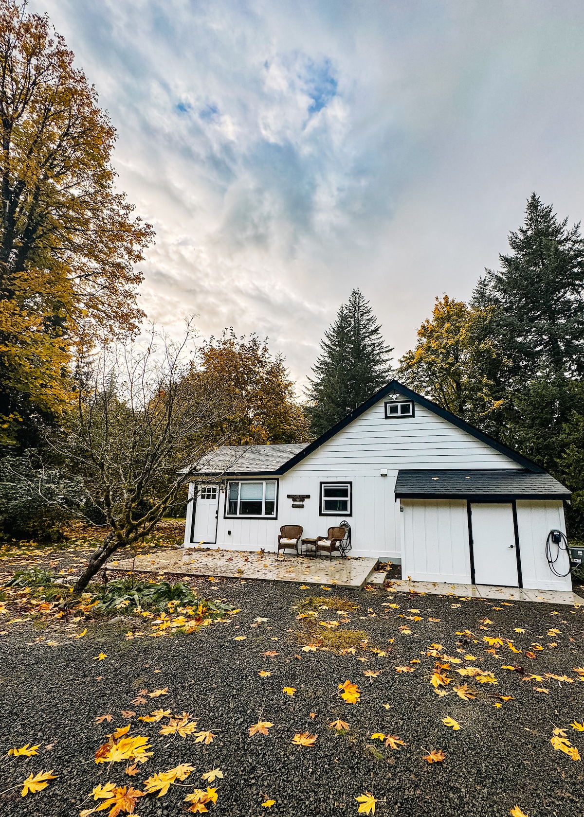 Our wonderful guest house is a cozy studio with a queen bed, kitchen, sofa, and dining table in one large room. There is a bathroom with shower. This is a second floor apartment over the detached garage, we live in the main house next door. The property is very secluded well off the road with no other houses nearby and borders the National Forest. Enjoy the spring fed pond in the front yard, a hike along the Sandy river, or a 15 min drive to ski resorts.