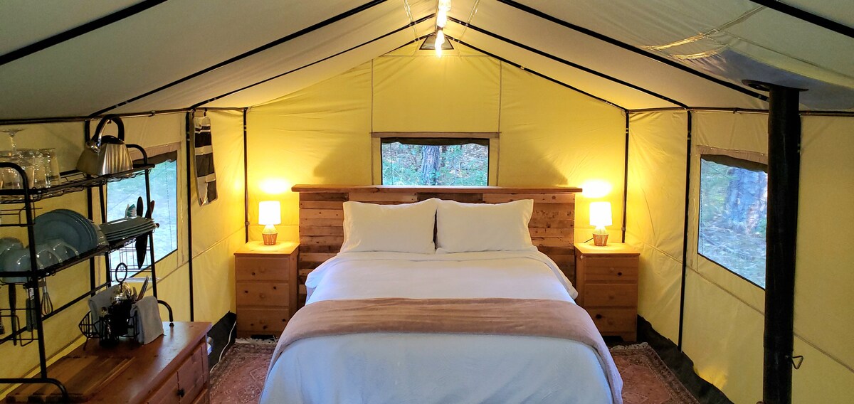 Welcome to Glamping! This luxury retreat is a camping dream. This heated handcrafted wood and canvas tent is themed in honor of the Oregon prospectors who came here 150 years ago. Our park is next to the North Umpqua River in the Umpqua National Forest. This area of the Oregon Cascades is referred to as "the Emerald-Jewel Gateway" to Crater Lake National Pk. We are centrally located to the North Umpqua Trail, with easy drives to many trailheads, waterfalls & Umpqua Hot Springs. NOT pet friendly
