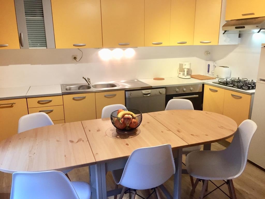 Appartement entièrement rénové et équipé pour 4 personnes,au premier étage.Une chambre lit double et un canapé convertible pour 2 personnes.Sèche linge et lave linge à disposition avec produits d’entretien.Machine à café,bouilloire,grille pain,lave vaisselle appareil à raclette et fondue.Draps fournie ainsi que les serviettes.Le tous à 2minutes de la gare de Modane à pieds.Tous les commerces à proximité à pieds . La rue est en stationnement gratuit et facile pour trouver une place.