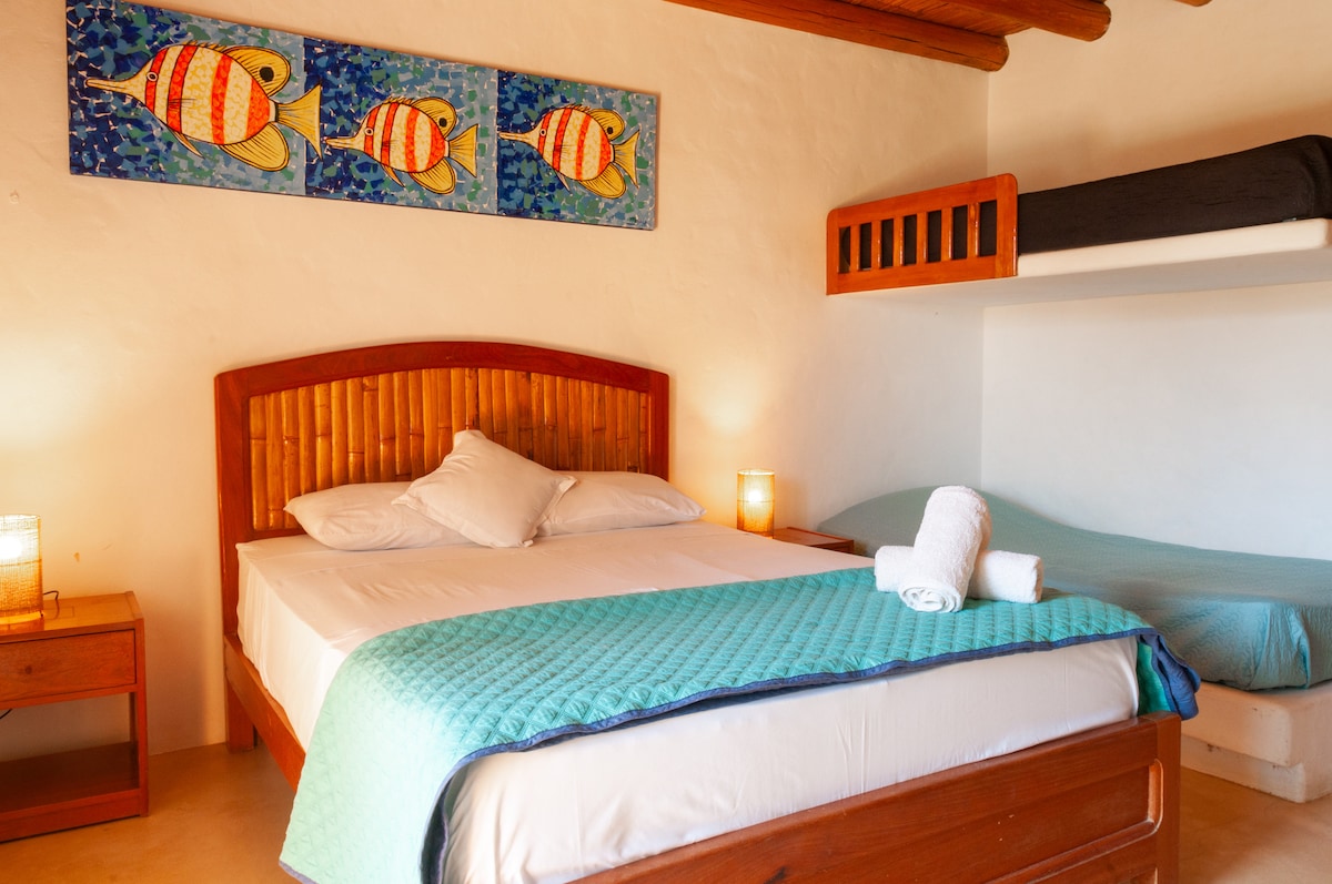 Nuestro Bungalow Queen tiene de una ubicación privilegiada con vista al mar y al jardincito que tiene al frente de su terraza privada. Este espacio rústico y acogedor cuenta con una cama Queen size y ventilador, garantizando una estancia cómoda y relajante con todos los amenities necesarios.