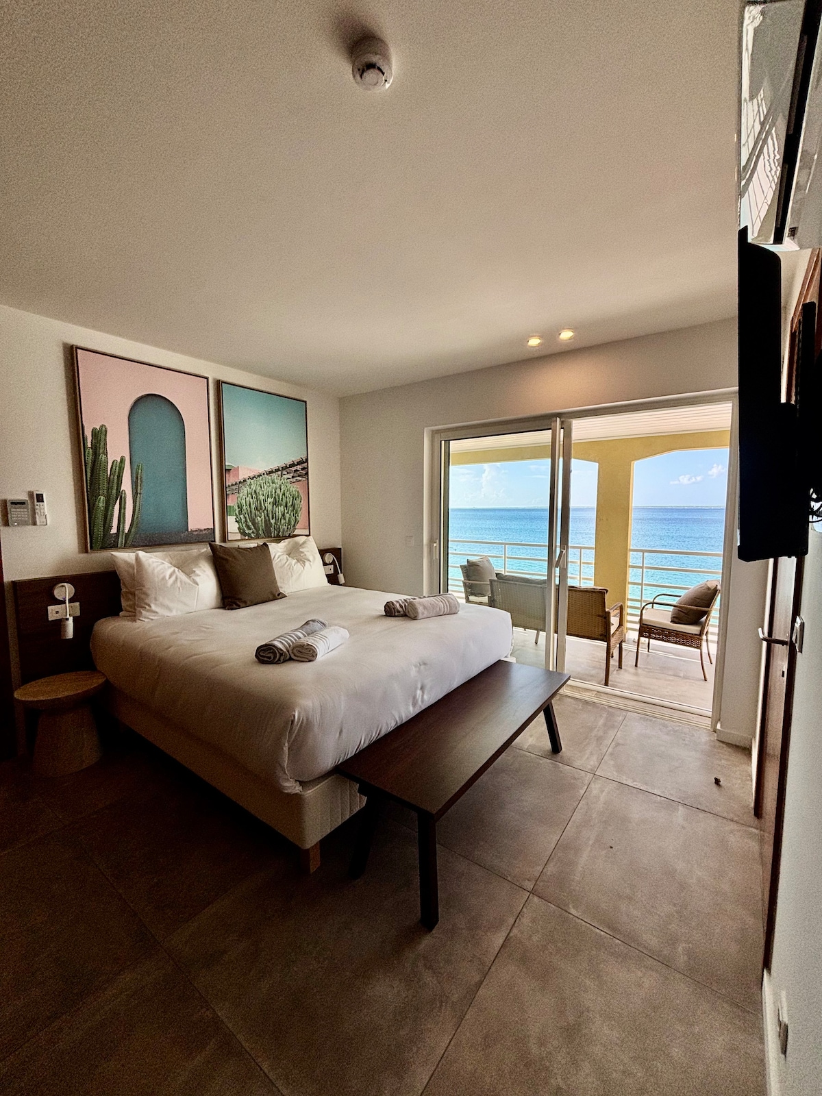 A rare beachfront stay in Grand Case. Suite 5 at Residence Mogador features 2 king bedrooms, an elegant shared bathroom, and a spacious terrace with panoramic sea views. Located directly on the beach, this bright and stylish suite is perfect for a getaway with friends or family. Secure residence with sun loungers, direct access to turquoise water, and the best restaurants of Grand Case just a short walk away.