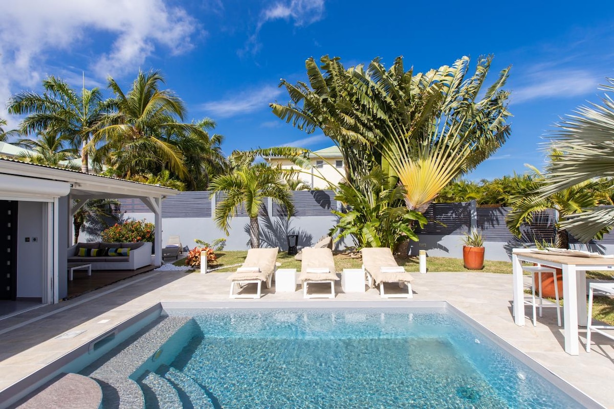 Villa Soliti is quiet and in the heart of Orient Bay. In 2 minutes walking you reach the beach and in 5 minutes the Village with its shops and restaurants. You will be as seduced by its outdoor space with terrace, swimming pool and private gardens as by its new and functional interior design. It is air-conditioned and has 3 bedrooms (king size beds), 2 bathrooms, 2 toilets. It has wifi, a safe, a gas BBQ and its kitchen is perfectly equipped for a friendly holidays!