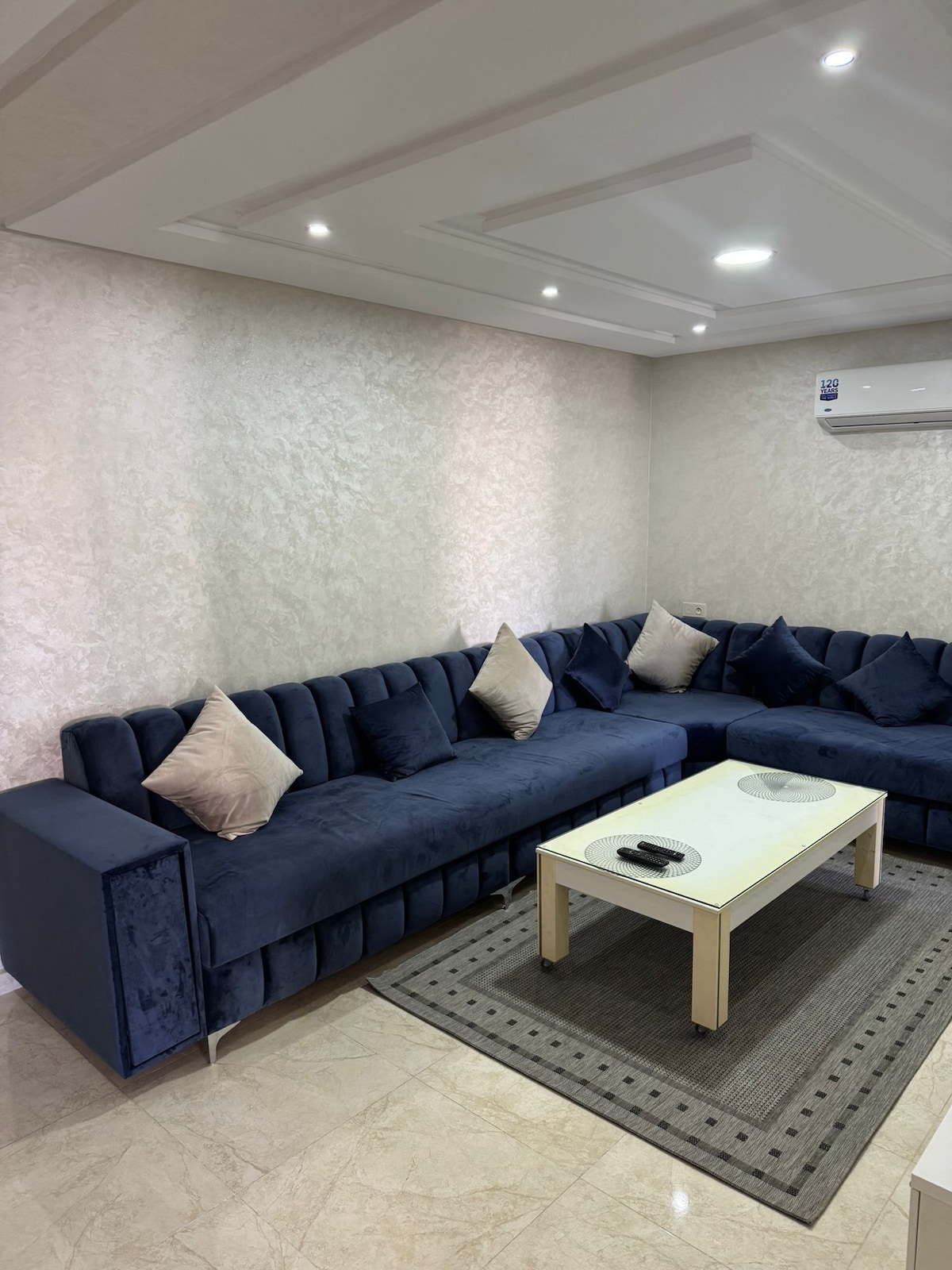 Super appartement climatisé en Résidence privée avec piscine, securité et parking gratuit.l appartement dispose de deux façade , est lumineux etspacieux orienté vers la Mer est composé de deux chambres, 2Salons,2SDB 2balcons et situé au 1er et etage,. Le grand balcon équipé en table et chaise,ayant vue dégagé sur Jardin et avec vue moyennement sur la piscine et doté d un balcon avec table vu jardin.L appartement e situé aux alentours de Marjane Market et Golf, aqua park et à 2min des plage