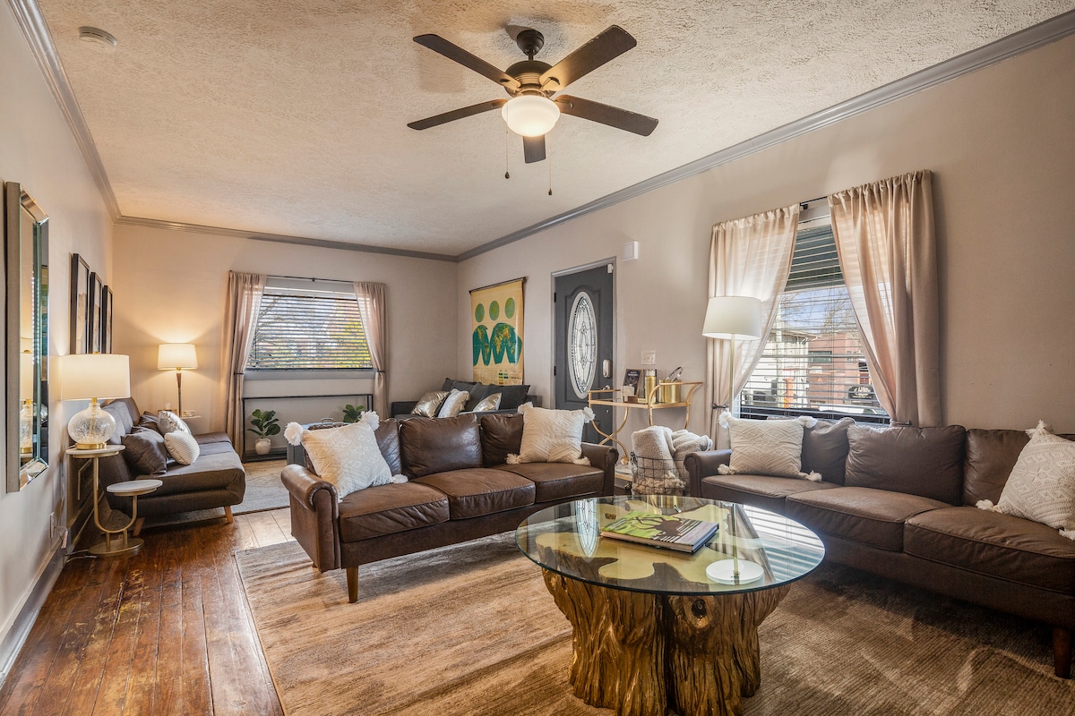 Sprawl out on a chic, mid-century sectional amid the retro flair, eclectic artwork, and vaulted ceilings within this captivating loft-style home. Cook dinner in a kitchen with soapstone surfaces and dine al fresco at an old-school table on the patio. Completely renovated with all new luxury hotel bedding, while keeping the original hardwoods, and charm of this older home. Two bedrooms on the 1st floor and two on the 2nd, easy access for all ages. 10 min, to downtown and the Expo Center.