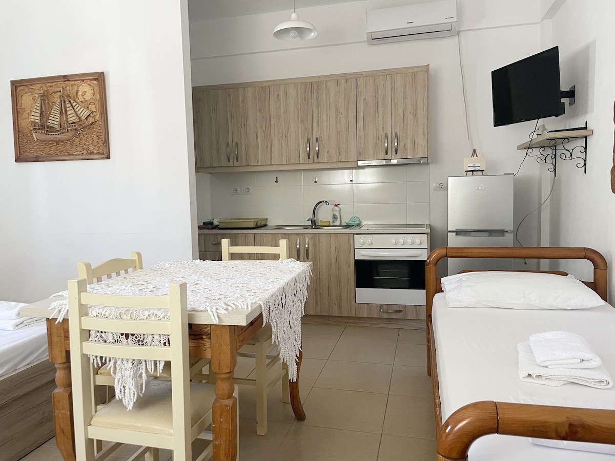Recently constructed apartment that combines a panoramic view of the sea and its stunning sunsets, with a cozy atmosphere.Entering the apartment you will encounter a spacious living room with a large sofa that can be transformed into a queen sized bed (for 2 people).You will also find a fully equipped kitchen.The roomy bedroom includes a king sized bed and a closet. Furthermore, there is a modern bathroom.*both the kitchen and bedroom have access to separate balconies and contain TV sets and AC.