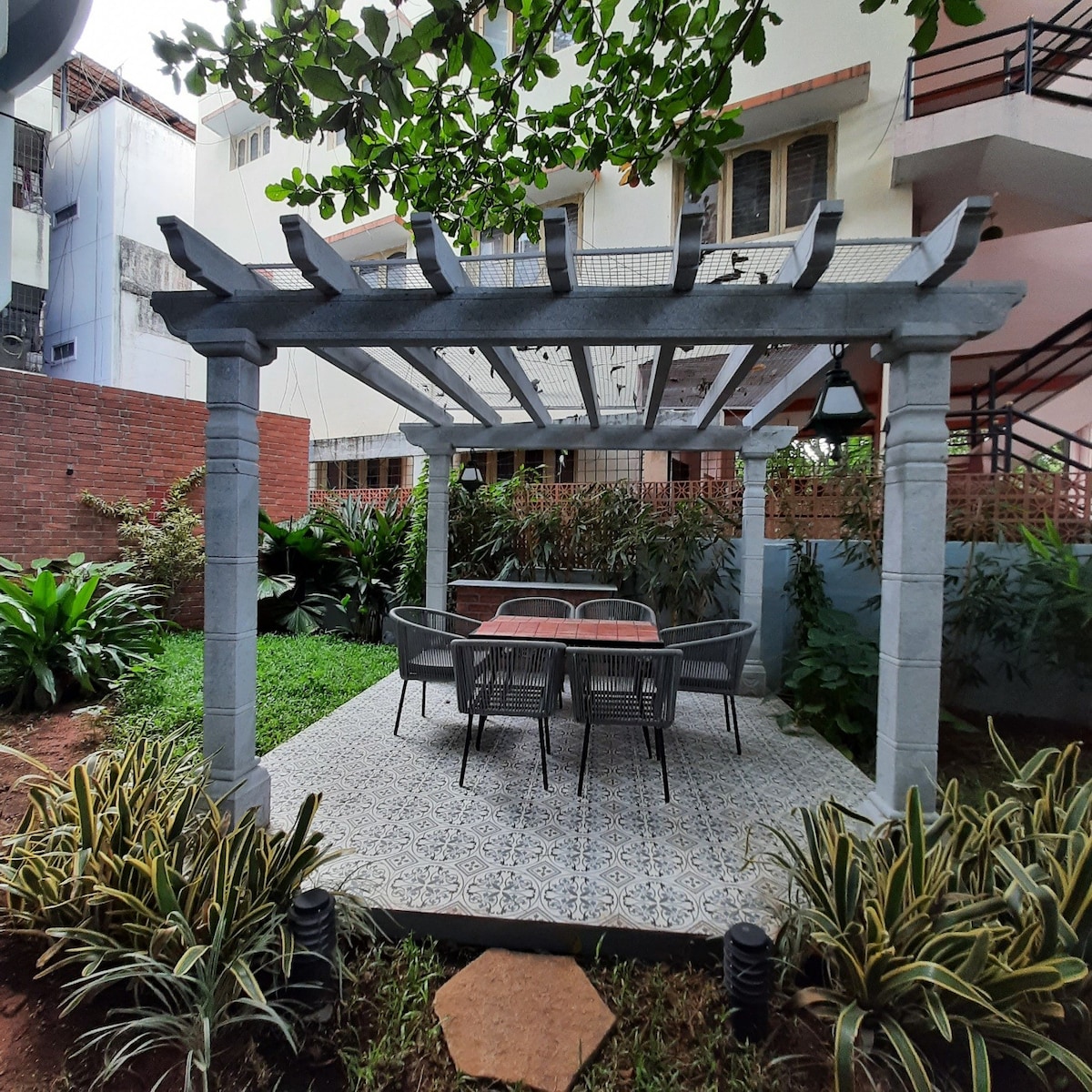 Fully furnished flat in one of Bangalore's most premium locality, just 30 mins from airport and 20 mins from CBD areas. There's a private garden with a gazebo and outdoor dining area where you can enjoy Bangalore's pleasant weather all year around. The spacious master bedroom has a King size bed, a single bed & a floor mattress. The 2nd bedroom has 2 single beds. Can accomodate 6 adults and 1 child. We take bookings only for purpose of stay, and not for parties or celebrations