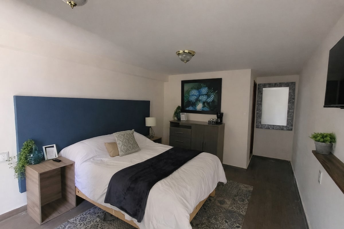 Disfruta de la comodidad de este nuevo alojamiento tranquilo y céntrico, con entrada autónoma. En el encontrarás todo lo que necesitas para tu estancia, muy cerca del paseo del río que te llevará al Teleférico, a unas de calles de la terminal de autobuses y del centro de la ciudad, donde se encuentra el Palacio de Hierro, Catedral, museos, restaurantes, etc. A unas calles del transporte público que te lleva a Poliforum Mier y Pesado, Parque de los dinosaurios, CasaVegas y Tobogán de la Montaña