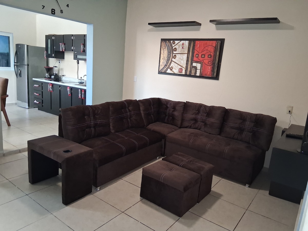 Te ofrecemos este espacio situado a pocos minutos de Plaza Valle y de atractivos turísticos como Casa Vega y Parque de los Dinosaurios. Cuenta con estacionamiento para un coche, dos habitaciones climatizadas , dos baños completos con agua caliente, cuarto de lavado ocina equipada, wifi y Smart TV Es un espacio pet friendly en el que tus mascotas son bienvenidas .Es de fácil acceso ya que está ubicado en el primer piso. Proporcionamos facturas si el huésped lo requiere.