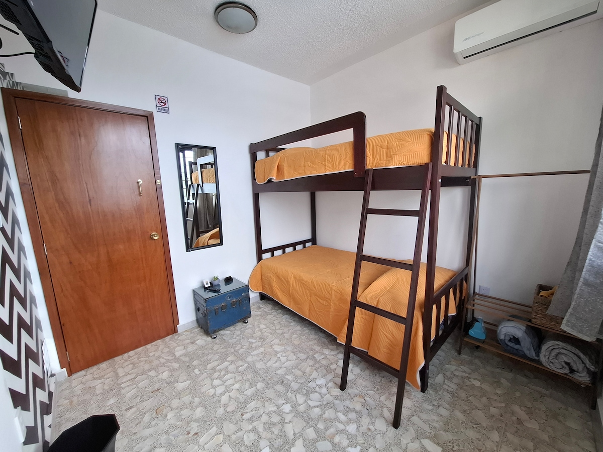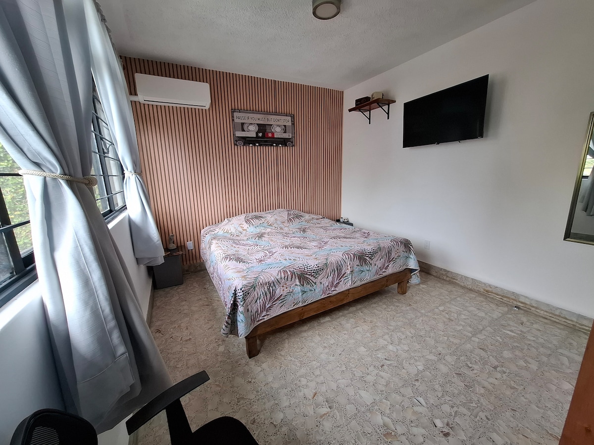 Disfruta del confort de la Suite que incluye aire acondicionado, una cama matrimonial y una individual con colchones premium, frigobar, plancha de ropa, secadora de cabello, pantalla, área de trabajo, guardarropa, Wifi y baño privado. Además de áreas comunes: red de descanso, jardín, medio baño, alacena con llave en la cocina para cada habitación, cocina equipada, dos salas, desayunador, comedor y Wifi en todas éstas áreas. Check in 2 pm. Check out 12 del día. Cupo: Tres personas