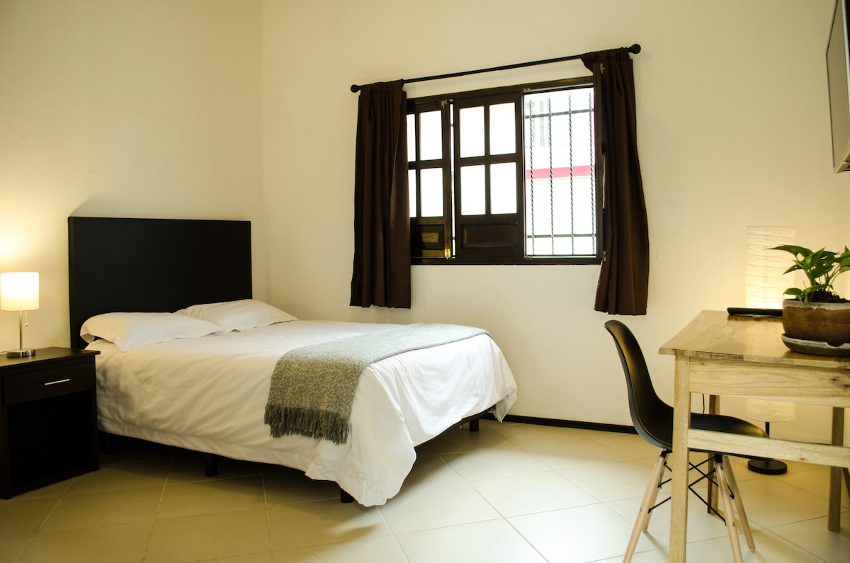 Con ubicación céntrica y entrada independiente, este lugar tiene todo lo que necesitas para tener una estancia cómoda. Cuenta con terraza con asador y mesa, un baño completo, cocina con equipamiento básico y sala con televisión, área de trabajo y sofá-cama matrimonial, la recamara es también matrimonial. Por su estratégica ubicación resulta muy cómodo, teniendo super mercados, restaurantes, cafés, parques, central de autobuses y el centro histórico a menos de cinco minutos a pie.