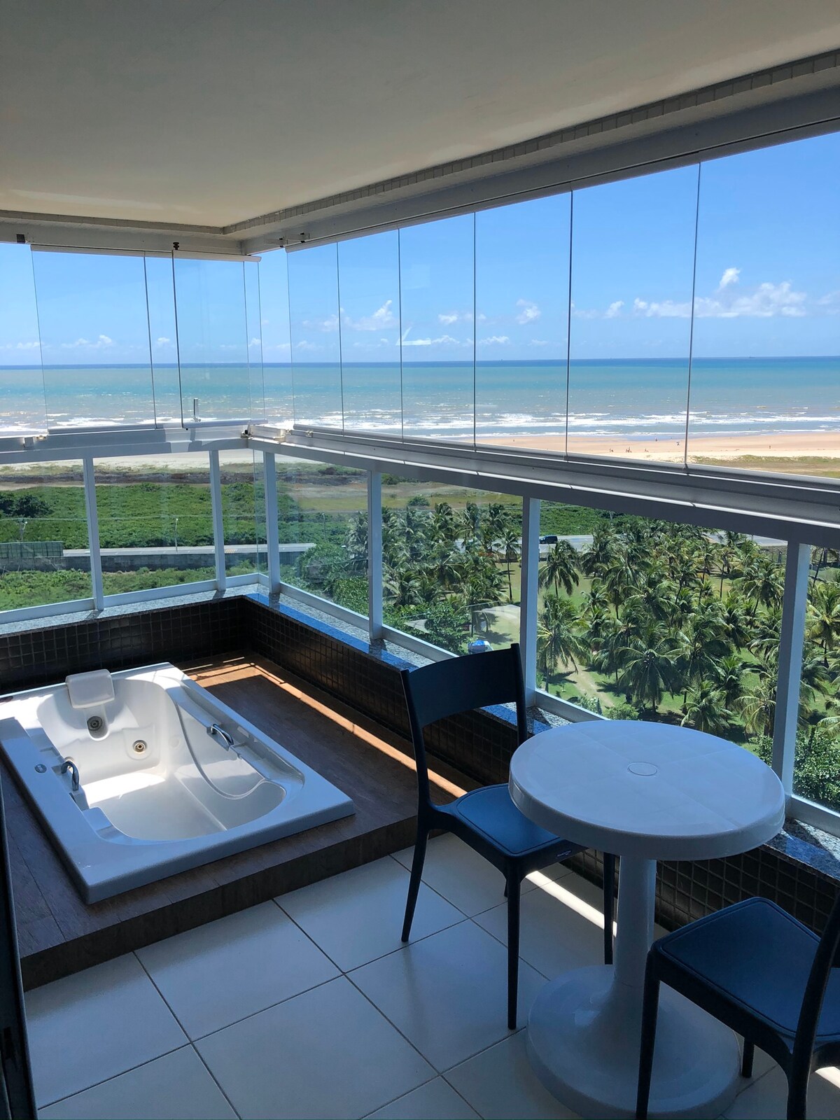 Apartamento à beira mar ,todo mobiliado, com jacuzzi (no momento a jacuzzi funciona só como banheira,)na varanda, vários eletro domésticos , máquina de lavar roupa, geladeira , cafeteira nespresso, pratos, talheres , liquidificador, sanduicheira, secadora de roupa,microondas , aspirador de pó, wifi, split nos 2 quartos e agora com com um espaço destinado para home office etc..