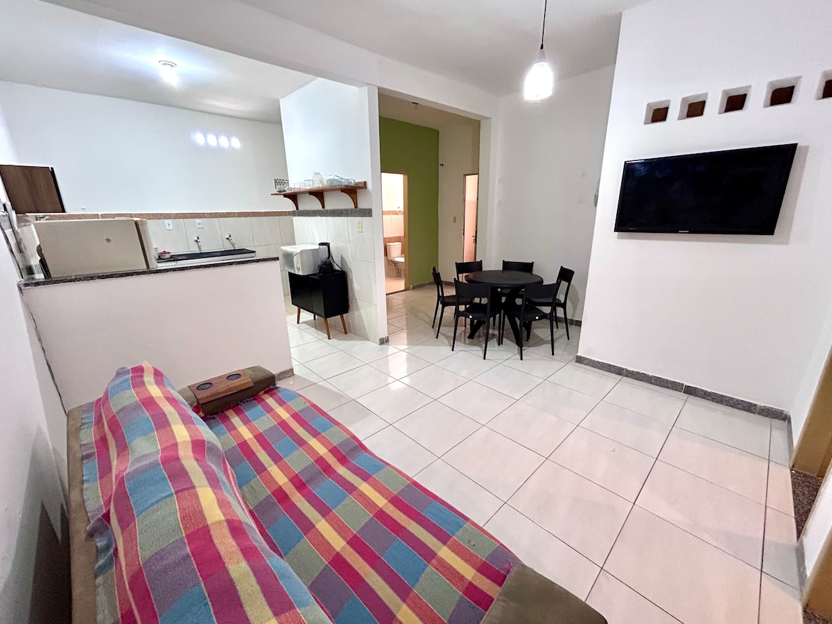 Great apartment with 50sqm, a few steps to the beach. Cozy 1 bedroom with double bed, bedside table, chest of drawers and clothes rack, living and dining room with table and double sofa bed, kitchen equipped with refrigerator, stove and accessories for the preparation of meals, service area and a wide balcony. Free garage and Wi-Fi. View to the sea. The condominium has 24 hour concierge, terrace with swimming pool, gourmet area, barbecue area, gym and a workspace in the lobby.