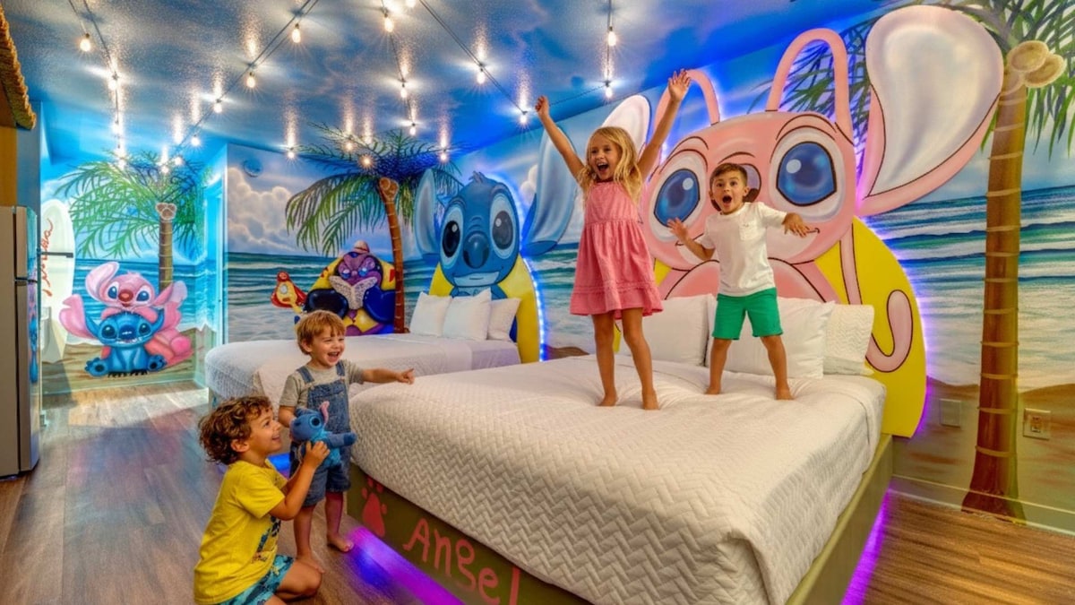 Bring the aloha spirit to your Disney trip in this Lilo & Stitch–themed studio at Legacy Grand in Kissimmee! Just 4 miles from Walt Disney World, this tropical escape features two queen beds with glowing LED “floating” frames, vibrant murals, and character details everywhere. Guests enjoy hotel-style amenities like a pool, shuttle to the parks, and on-site laundry, making this playful retreat the perfect mix of convenience and fun.