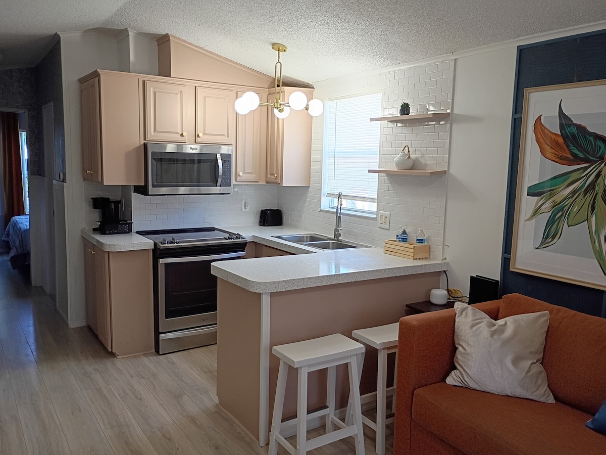 Welcome to Bitty Bliss, a cozy tiny cottage getaway just 20 minutes from Disney and Universal and only 5 minutes from shopping and dining. Enjoy resort style amenities including pickleball, mini golf, a new gym, and rec room. Smoke free and pet free with no resort or parking fees. Sleeps up to 4 with a queen bed and a comfy sleeper sofa for rest and adventure Perfect for couples, families, or theme park trips, offering comfort, charm, convenience, and a relaxing home base after full days.