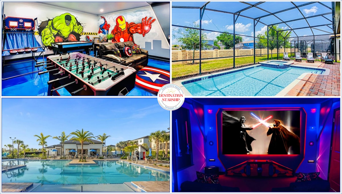 <b>Stylish villa fully renovated with themed movie theater and game room, west facing private pool & spa and in a gated community</b> -8 Bedrooms (2 master suites) – Themed Kids Bedrooms -Starship Movie Theater 120" 4K screen -Game room - Xbox & PS4, basketball and air hockey games (AC equipped) -West facing Heated Pool/SPA ($30/day extra) -And free access to The Oasis and The Retreat Club Houses. Within 20-30 min of all theme parks, great shopping, restaurants & the Orlando Int'l Airport