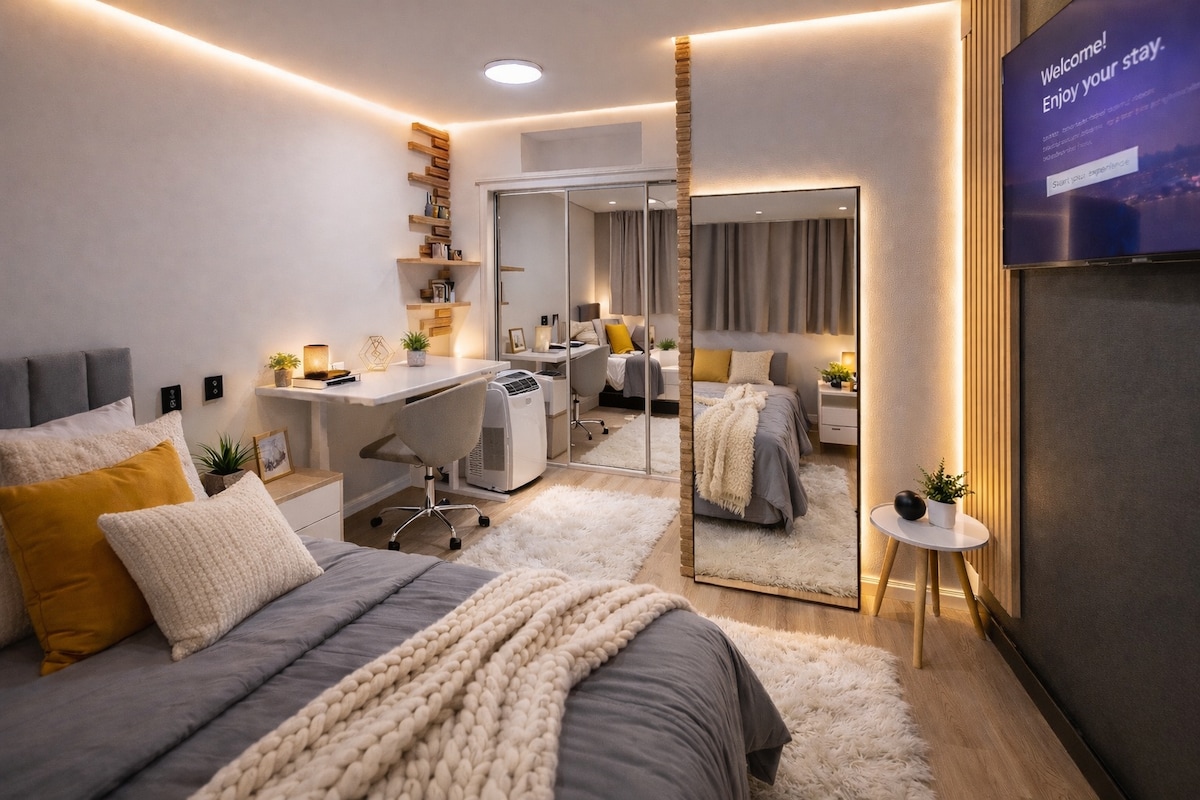 Check-in 6 PM • Check-out 10 AM Early (1 PM) or late (5 PM) from $49 Romantic designer loft with a fireplace wall, cinematic lighting, and a deep soaking tub couples love. A private, stylish escape near the airport, downtown, and major theme parks. Close to top restaurants and attractions, yet designed for relaxation and comfort with no shared spaces. Adjustable queen bed, spa-style bath, fireplace ambiance, second parking spot ($19 extra). No smoking | No pets.