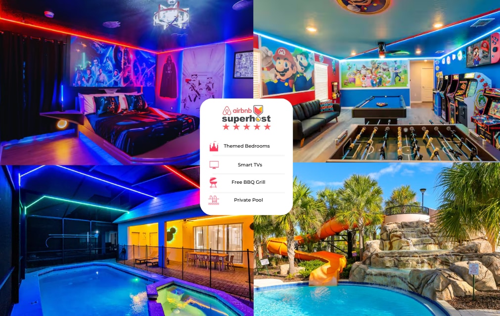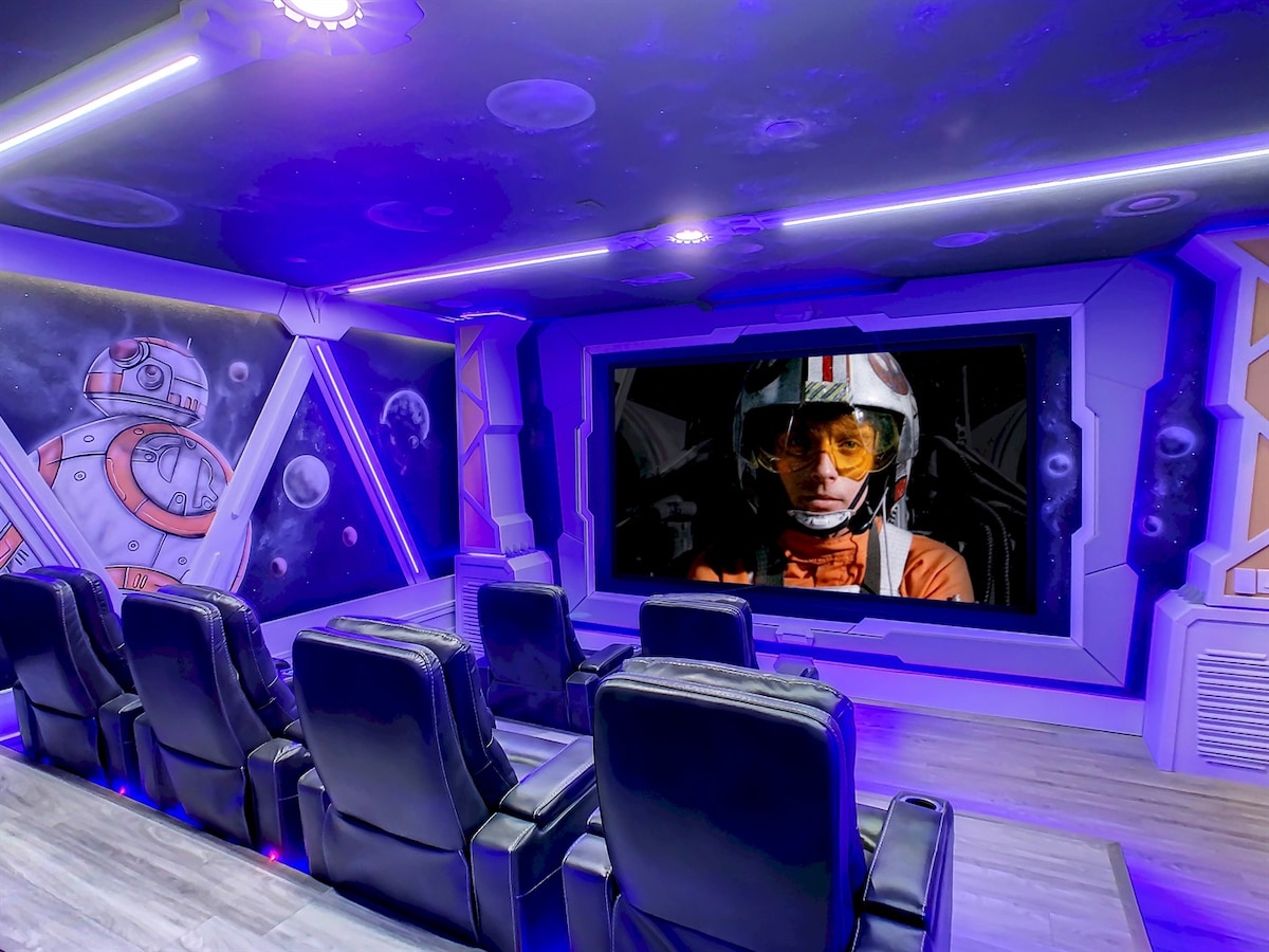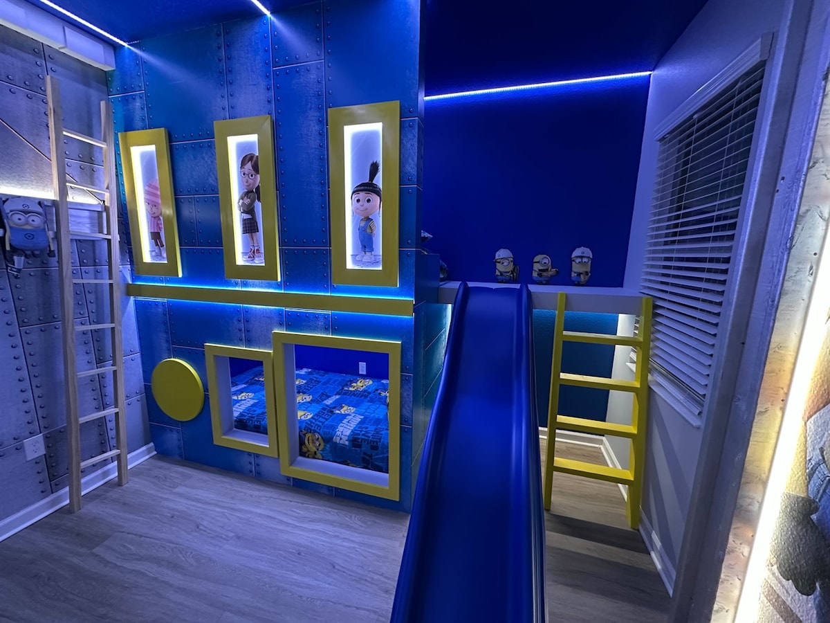Epic 10-bedroom themed luxury villa near Disney — sleeps 22 — with private pool & hot tub, movie theater with reclining seats, and a Marvel/LEGO arcade featuring racing simulators, air hockey, foosball & pinball. Includes elegant king suites and magical kids’ rooms (Toy Story, Star Wars, Minions, Beauty & the Beast). Perfect for multi-family getaways — just 20 minutes from Magic Kingdom.