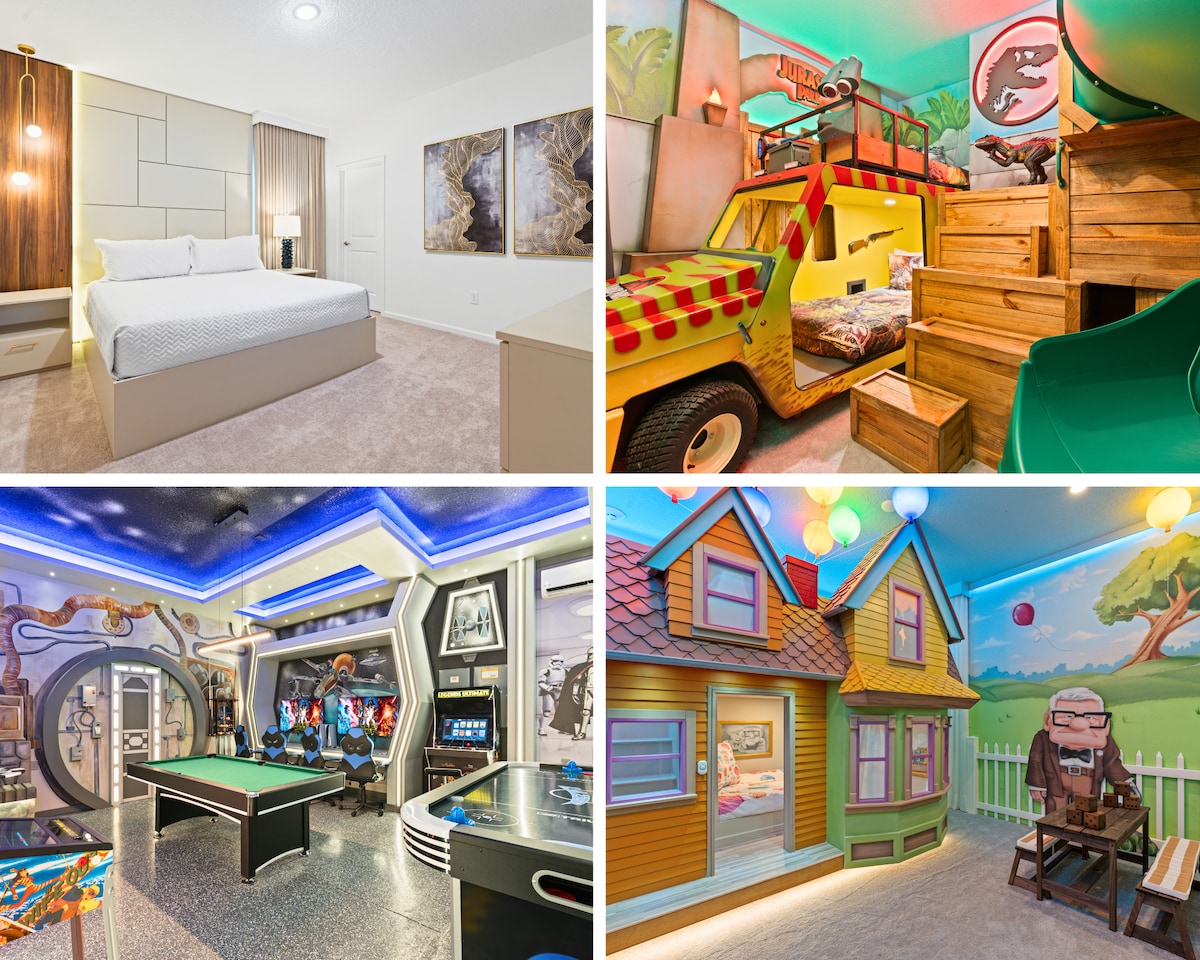 Unable to book this house? Don't worry! Feel free to check my profile for similar homes that might suit your needs WE HAVE 24/7 CUSTOMER SERVICE Disney is just a short 8-mile drive away Tired of visiting the parks every day? Step inside this beautiful thematic 2,169 sqft house with a private pool, spa, BBQ, Star Wars themed movie theater, and a Mario Kart game room complete with arcades, pool table and foosball table all designed for family enjoyment! Make your vacation truly unforgettable!