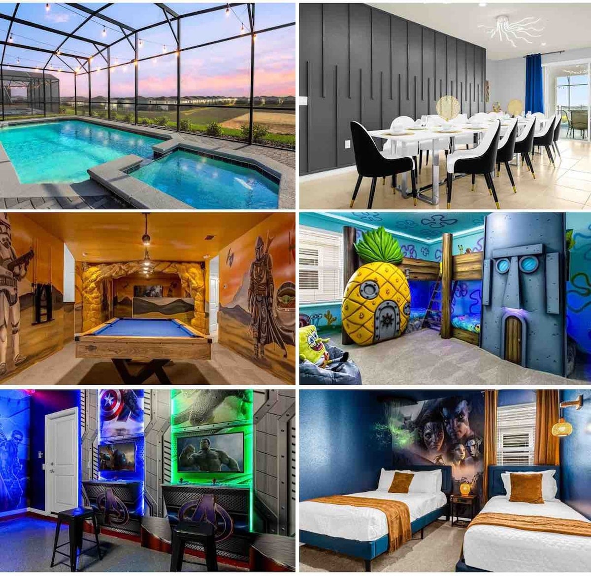 Stay in our beautiful villa at the brand-new Windsor Cay Resort, perfect for families and groups seeking comfort, safety, and fun in Orlando. The home sleeps up to 12 guests and features 5 bedrooms — including two themed rooms — a private heated pool*, fully equipped kitchen, laundry room, and fast Wi-Fi. Located just 20 minutes from Disney, with easy access to Universal, SeaWorld, and outlet shopping.
