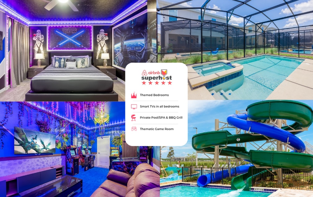 This stunning Storey Lake Resort Villa is the perfect getaway to relax and enjoy your time in Orlando, Florida. Just minutes to Disney World & within easy reach of attractions, shopping and dining. This immaculate & exceptional villa has a heated pool and spa (no additional charge) to relax in after a busy day at the parks. Family friendly featuring Super Mario & Frozen bedrooms, as well as three king size bedrooms, along with a Harry Potter themed movie loft & Spider-Man themed game room!