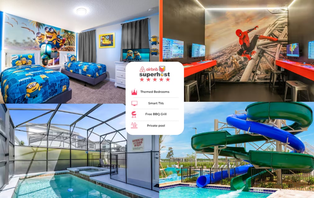 SuperVilla at Championsgate is a brand new 8bd luxury villa that comes with its own pool and spa, poolside and indoor movie theater, karaoke, arcade room, 4 themed rooms(StarWars, Harry Potter, Frozen, Encanto) and 4 master suite. But the excitement doesn't stop there – a mere 3-minute walk leads you to The Retreat Club, with complimentary access. Revel in mini golf, towering water slides, a splashpad, zero-entry pool, cabanas, and delectable cocktails and cuisine. Your unforgettable family adve