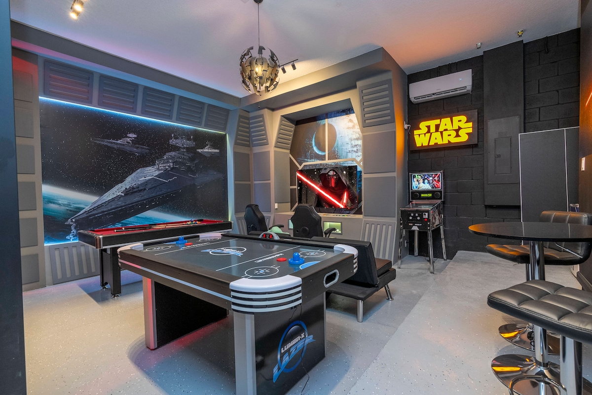The perfect balance of STYLISH DESIGN, LUXURIOUS COMFORT, & ENDLESS ENTERTAINMENT, beautifully situated with stunning views in the sprawling 3.5 square mile Reunion Resort. You will have your own private pool, spillover spa, STAR WARS cinema-game room with pinball, classic arcade games, and karaoke, MARVEL kids room with tube slide and double bunks, the latest Xbox Series S, a sprawling 2000 ft2 pool deck, fire pit, and even a HARRY POTTER cupboard hidden under the stairs, minutes to Disney.