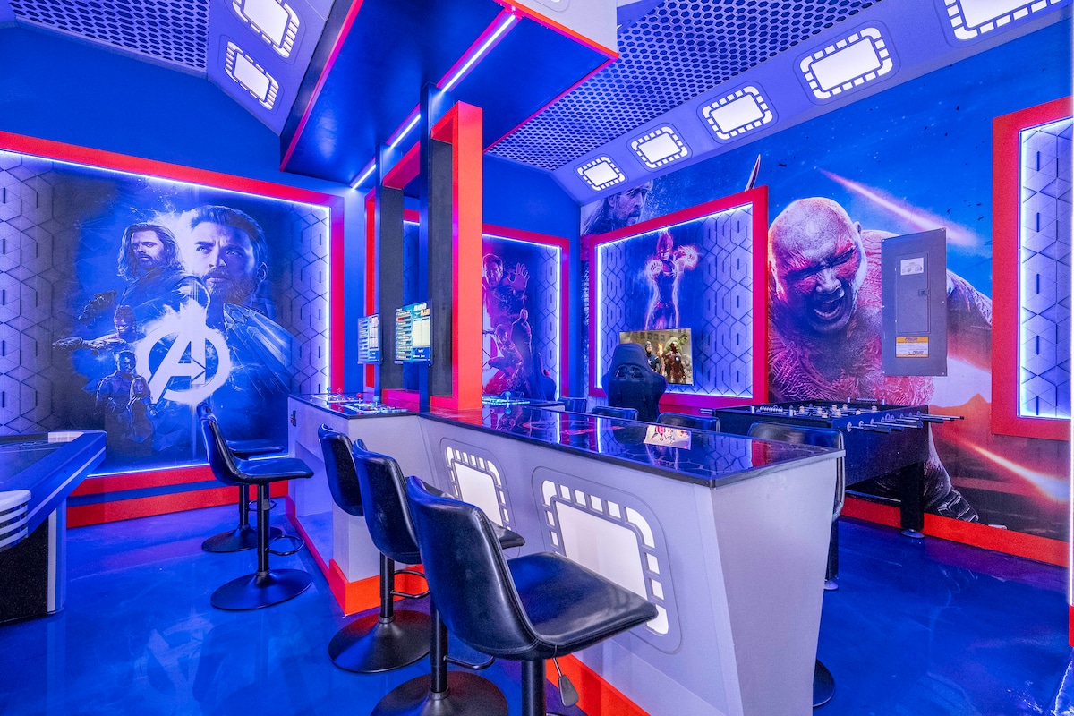 The perfect balance of STYLISH DESIGN, LUXURIOUS COMFORT, & ENDLESS ENTERTAINMENT in the stunning 3.5 square mile Reunion Resort. You will have your own private pool, spa, movie theater - game room, 3 master suites, 3 incredible themed bedrooms (MARVEL, FROZEN II, NASA) for kids or adults, the latest Xbox Series X game station, a 2500 ft2 pool deck overlooking a beautiful forest and pond, fire pit, & billiards table, minutes to Disney.