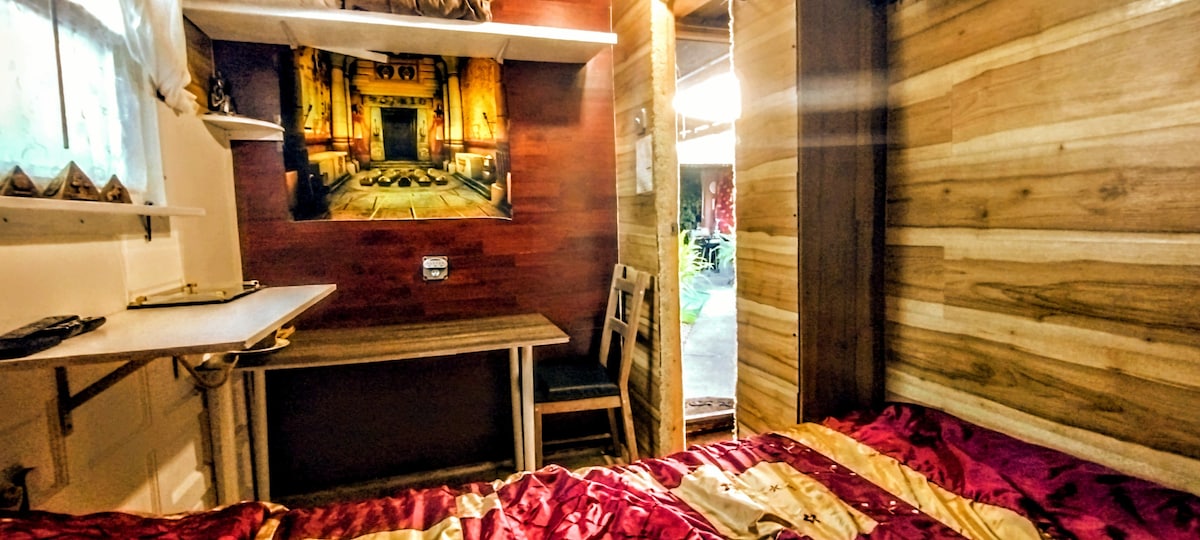 Located in a safe area, 3 min walk to bus #15, this cabin or camper (your choice) is best for 1 person. Kitchen is on the nearby patio. Outside shower and bathroom nearby. They are NOT inside the camper/cabin and are SHARED with others. Campers are not very well insulated. Not a greate option if planing to stay inside all day. Full size bed and single bed, A/C, storage area under and over beds and a rod for hangers. The cabin has a full size bed, wall AC, heater, coffee maker and a microwave.