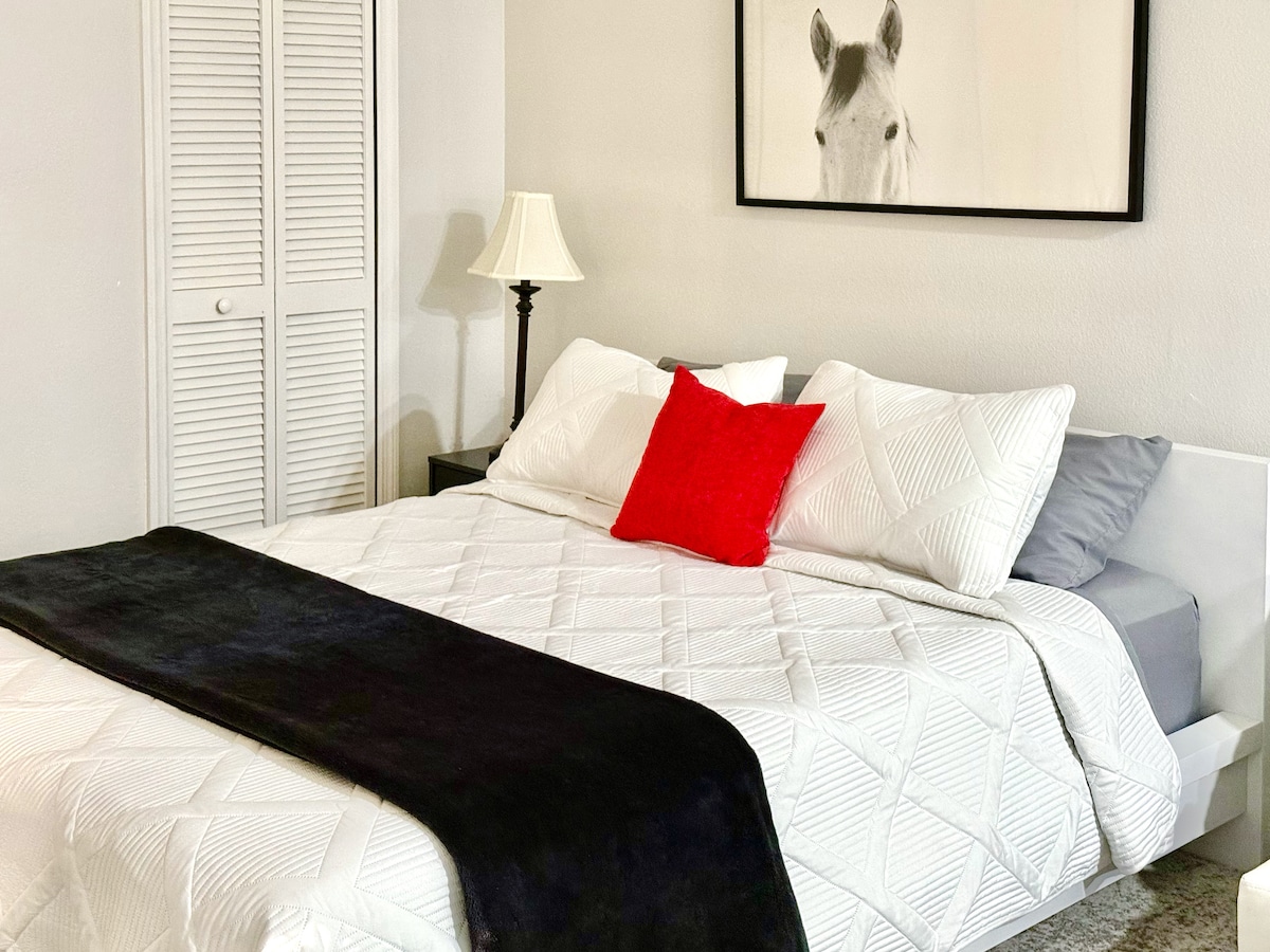Beautiful over-sized private 1 bedroom cottage, overlooking the lake. We are close to several other lakes and dog friendly parks to explore. Comfort was our number one focus when choosing furniture, and there is even a king sleep number mattress in the bedroom. The kitchen is fully equipped with a dining area, living area, desk/office space, washer, dryer, flat screen TV, wifi, cable TV with HBO, Netflix & Amazon. Light breakfast & snacks. Please note there is an additional charge to use pool.