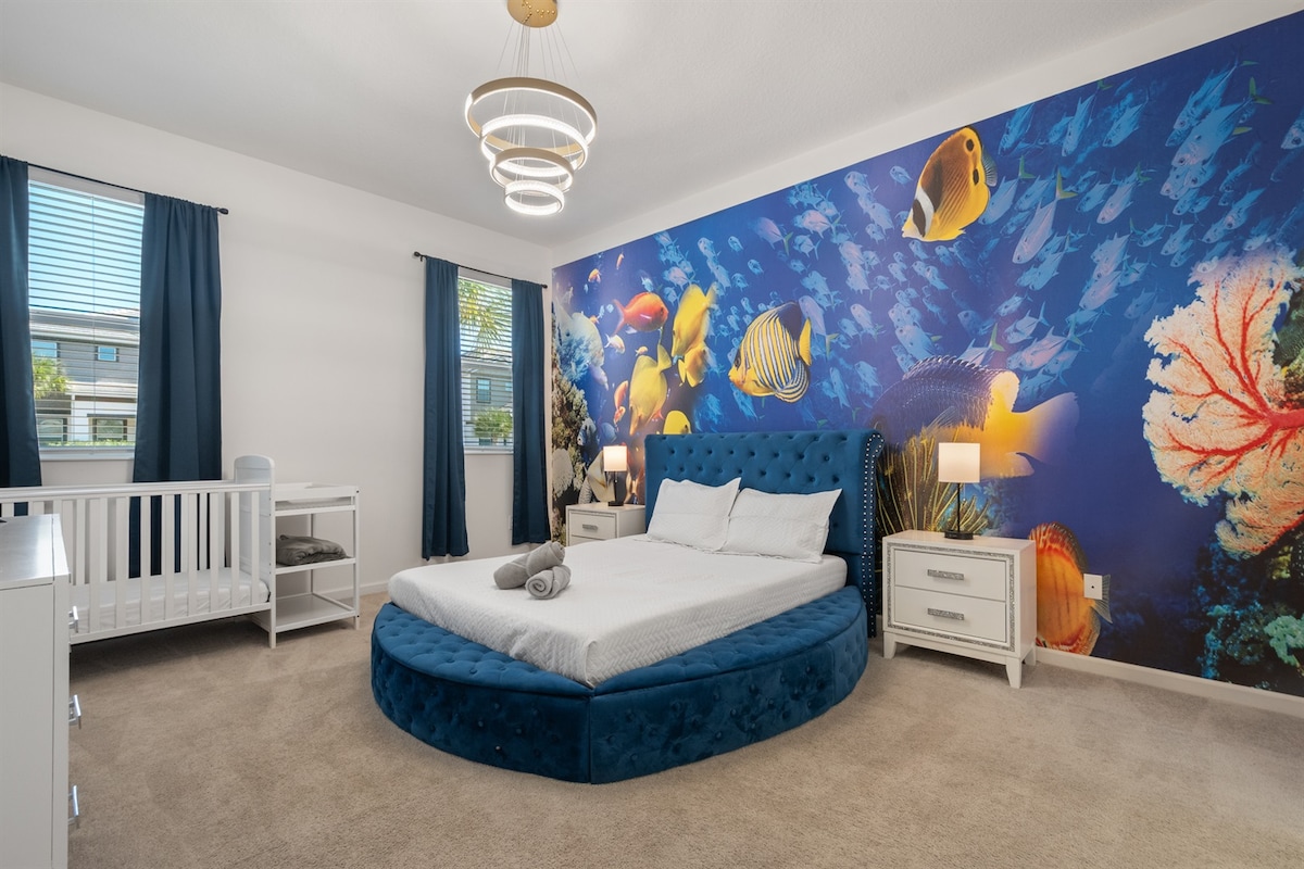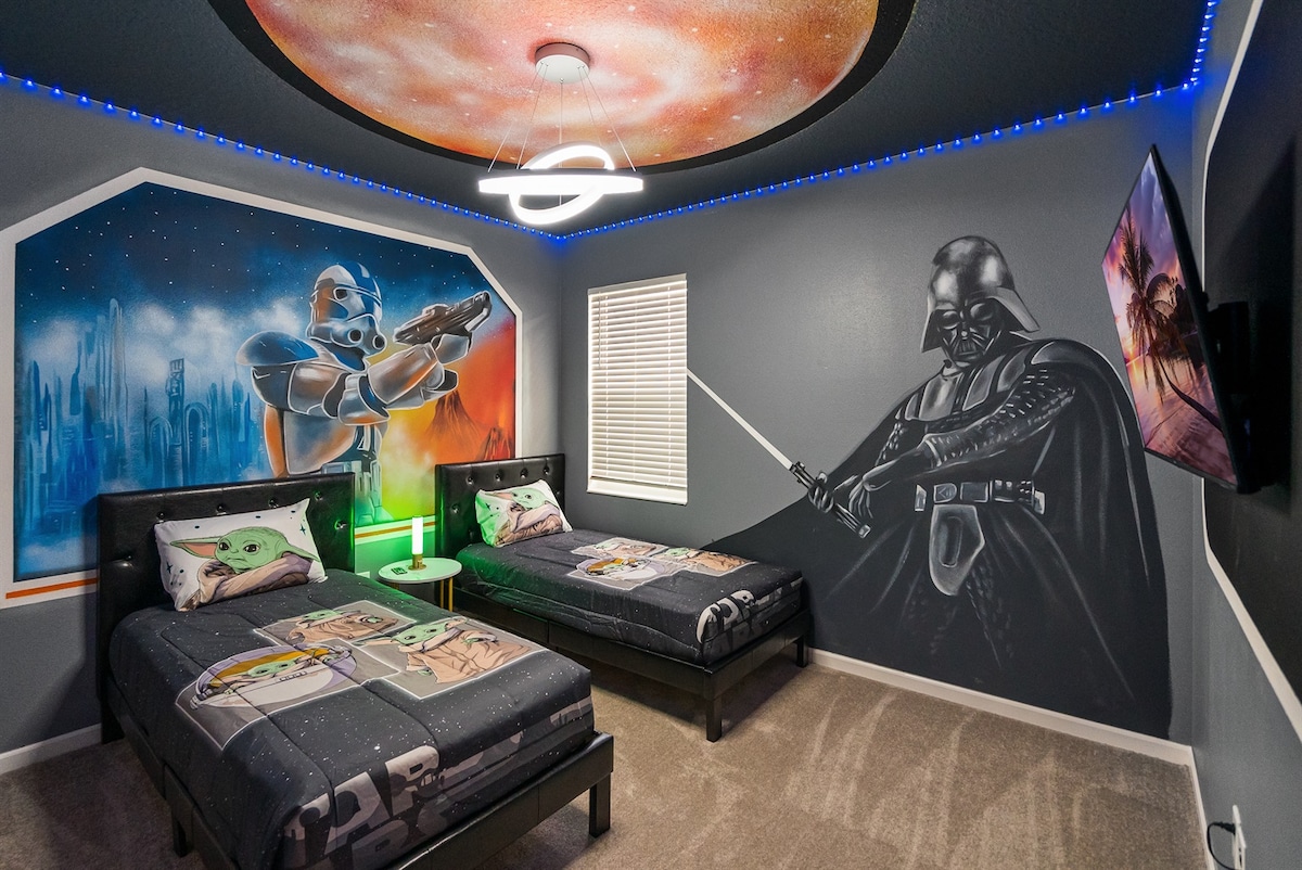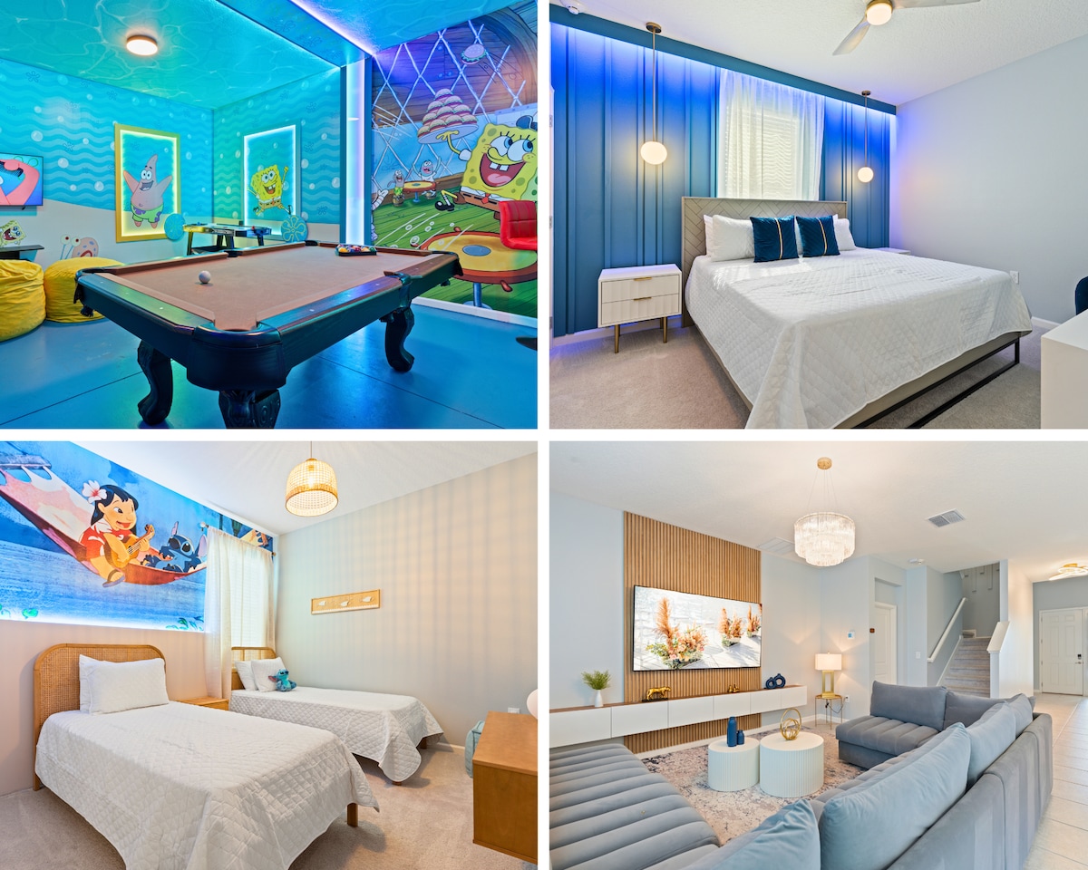 Epic 10-bedroom themed luxury villa near Disney — sleeps 20 — with private pool & hot tub, movie theater with reclining seats, and a Marvel/LEGO arcade featuring racing simulators, air hockey, foosball & pinball. Includes elegant king suites and magical kids’ rooms (Toy Story, Star Wars, Mickey, Beauty & the Beast). Perfect for multi-family getaways — just 20 minutes from Magic Kingdom.