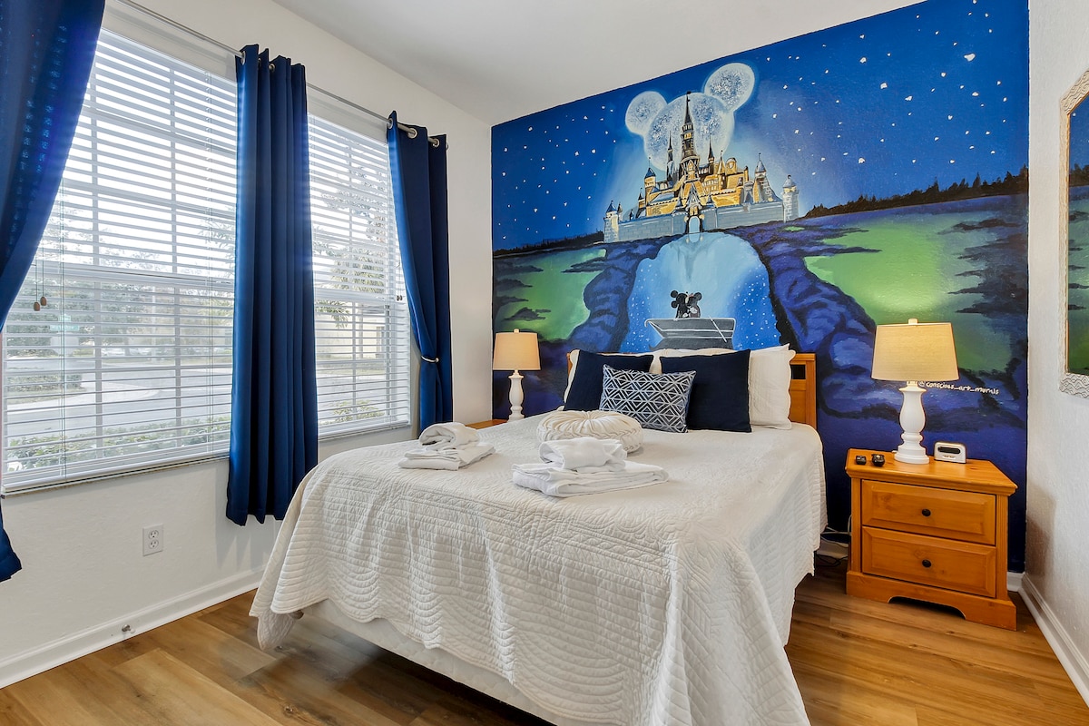 ❤ Illusion room with character outfits ❤ Private pool with water view ❤ 15 min to Disney ❤ 25 min to Universal, SeaWorld, Convention Center, 2 min to Walmart ❤ Game room with board games & kids toys ❤ 100" movie theater screen ❤ Free Netflix ❤ Fully equipped kitchen ❤ Sleeps 12 ppl ❤ 2 king beds, 2 cribs, 1 Queen memory foam sofa bed, 6 twins ❤ Newly renovated home ❤ Fully stocked home ❤ Alice in Wonderland®-themed home ‼️ No parties, No smoking, 4 dogs max $75/pet