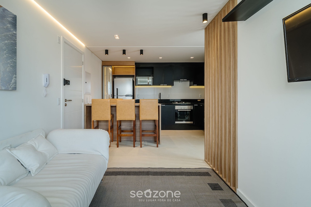 Modern and welcoming, this studio blends integrated spaces, great lighting, and a design that highlights every detail. The planned kitchen connects to the air-conditioned living area with sofa and Smart TV, while the bedroom offers a comfortable bed and mirrored wardrobe. Just minutes from Beira-Mar, cafés, markets, and access routes to Downtown, your stay becomes lighter and more convenient. Secure your reservation and experience Floripa with sophistication.