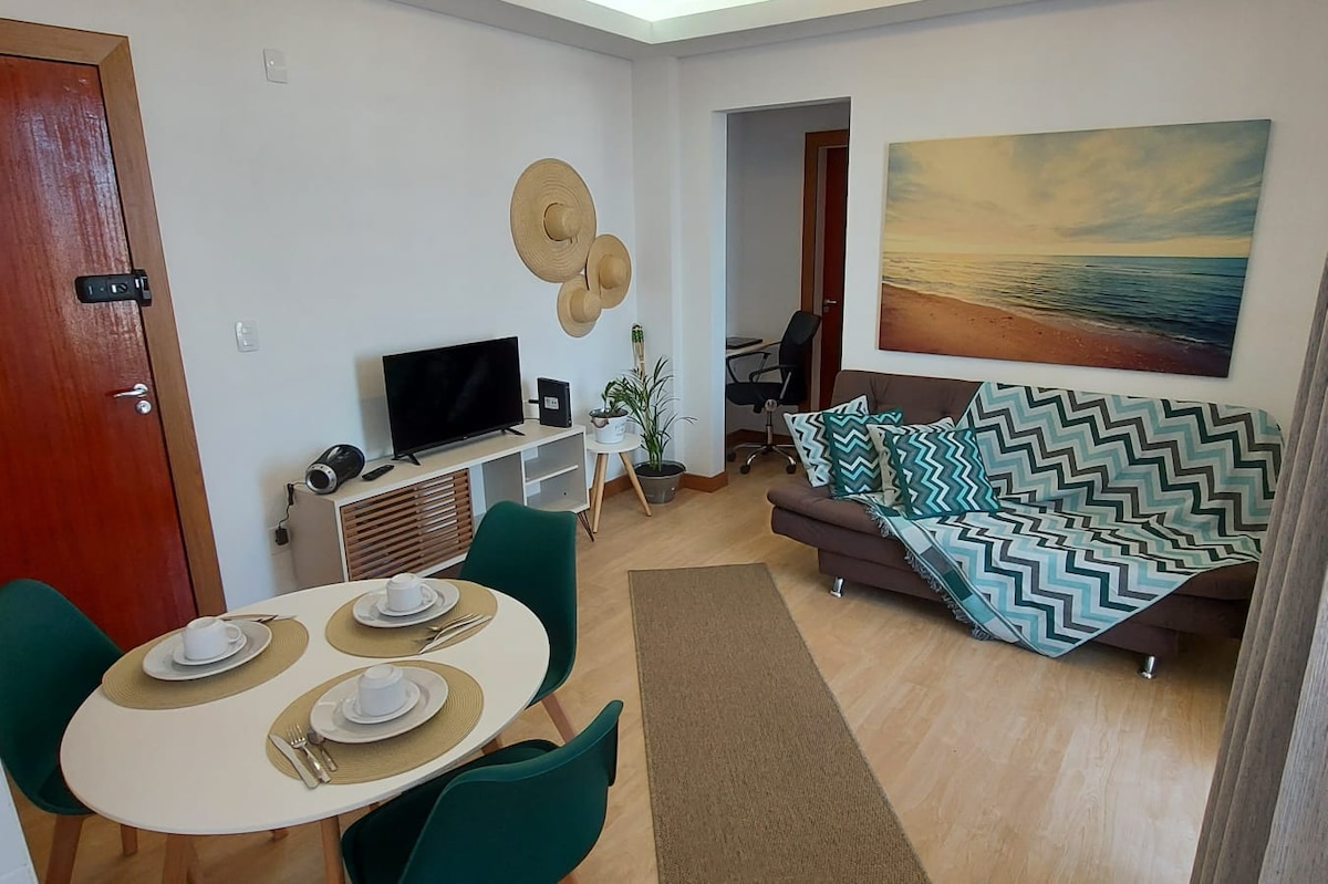 Modern and welcoming, this studio blends integrated spaces, great lighting, and a design that highlights every detail. The planned kitchen connects to the air-conditioned living area with sofa and Smart TV, while the bedroom offers a comfortable bed and mirrored wardrobe. Just minutes from Beira-Mar, cafés, markets, and access routes to Downtown, your stay becomes lighter and more convenient. Secure your reservation and experience Floripa with sophistication.