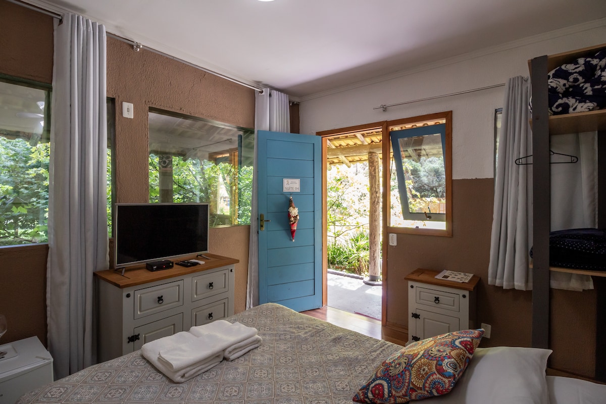 The room includes a queen-sized bed and a private shower. A mini-fridge and a heater are available in the room, which also features a private balcony overlooking the garden. Additionally, the room is equipped with a ceiling fan and a large mirror.