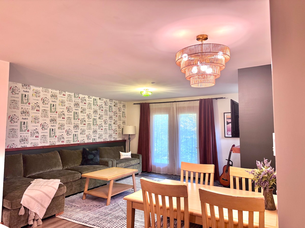 This condo lies in the heart of the original Jay Village, offering flexible living space for a family or group of friends. With 2 bedrooms and 2 bathrooms, everyone can have the space that they need. Access via private entrance with a mud room for leaving all the outdoor gear, in summer and in winter. Enjoy free parking, outside space and a balcony with a serene view into the woods. Make the most of the resort activities (Water park, pool, golf, ice rink) for a fee to the resort.