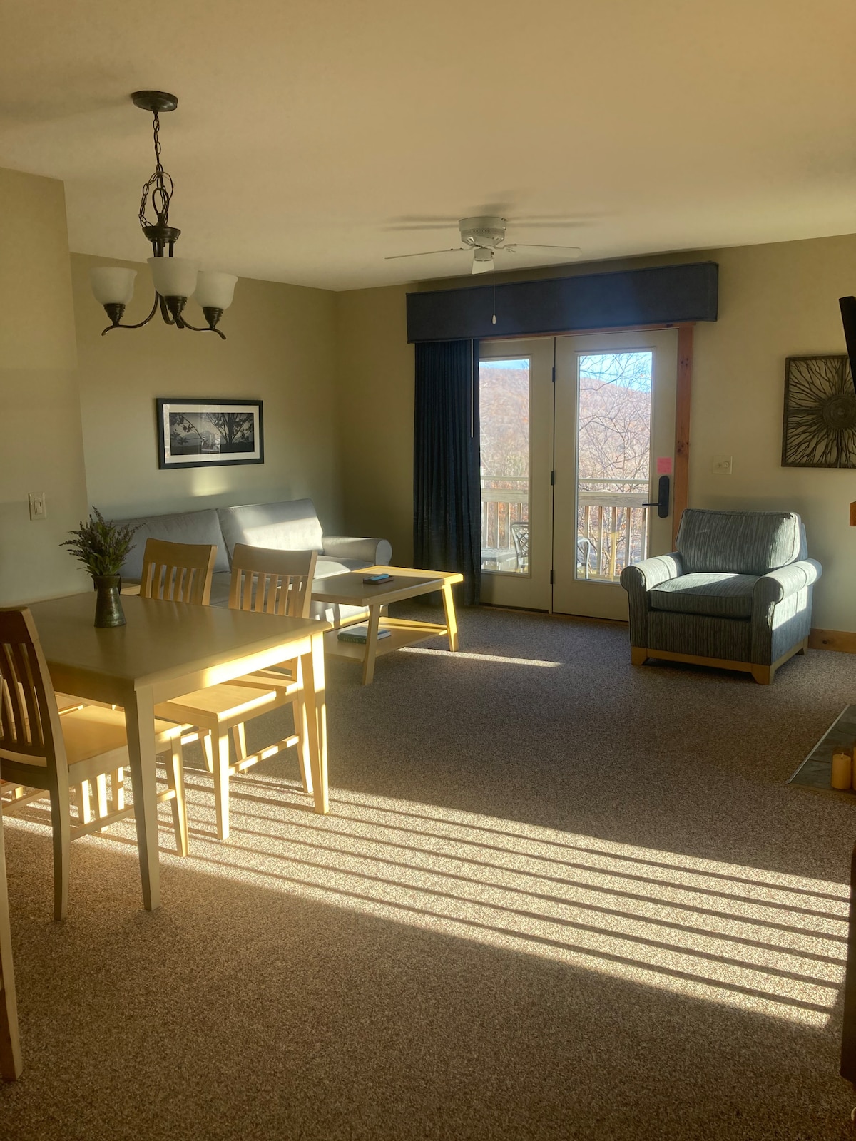 Welcome to our Mountainside Jay condo! This cozy 525 sq foot studio has a queen murphy bed, a queen sofa bed & a gas burning fireplace. Located directly across the street from the golf course/nordic center, next to the Ice Haus & the Water Park. Walk to the tram in the morning. Great destination for a small family, couples getaway or just a place to rest your head after a long day skiing/boarding. Newly renovated bathroom. Sweet and simple. Pets welcome!