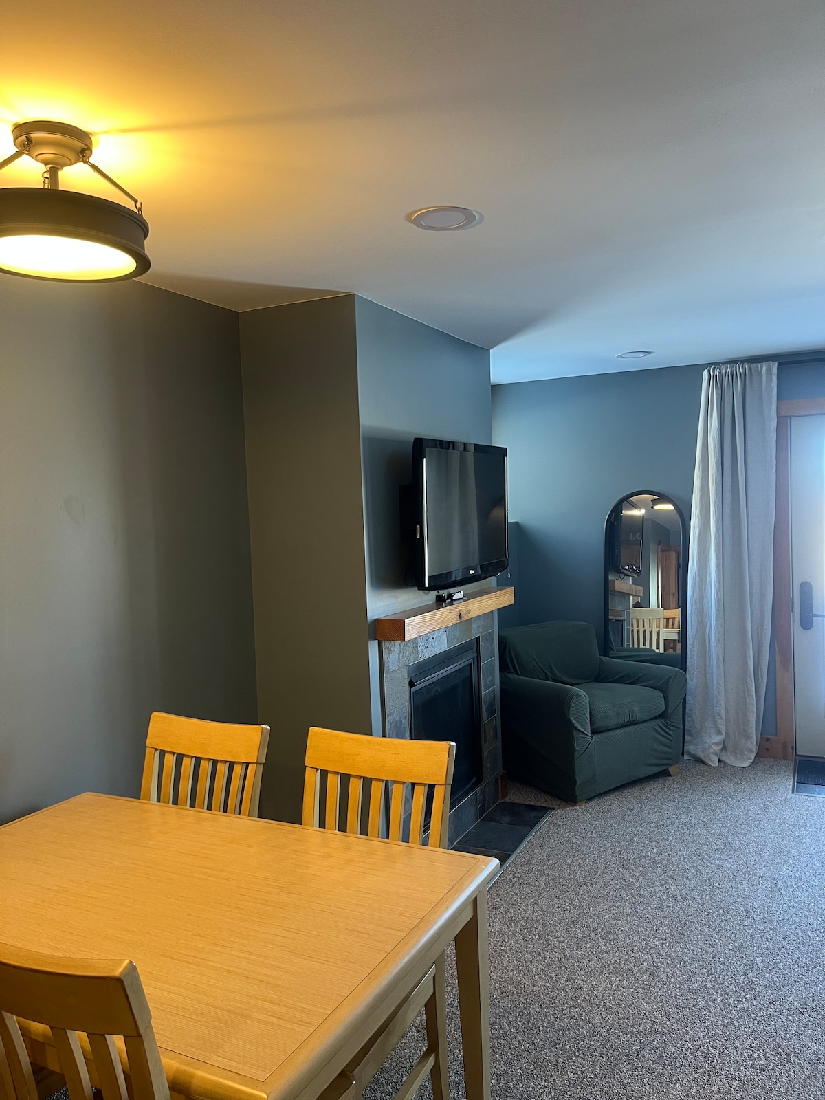 Our condo sports everything you will need for your stay. We have one bedroom with a queen bed, and two twin pull out couch beds in the living area. Full kitchen, laundry, dining area, porch with dining table and chairs, and an electric BBQ grill. Condo has direct Kingdom trail access on site, bike storage is ok inside or on porch. There is some summer siding work going on, the crew is very good but be aware work commencing. Enjoy your stay!!
