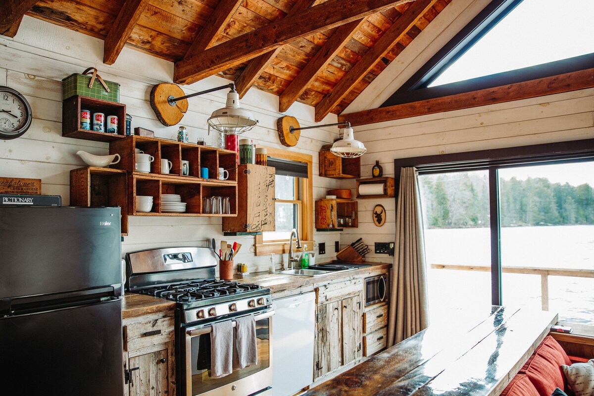 A stunning renovation of a 100-year old Boathouse, this cabin sleeps two and features a full kitchen & bathroom. The Boathouse is situated right at the lake's edge and has a full glass front, deck with a grill to take advantage of unbeatable sunset views. You will also have a private dock and canoe. Perfect getaway for couples who are looking to explore or just unplug and spend a few days relaxing. Wapanacki is dog-friendly! Please see info about our pet fee in the notes below. Sorry-no cats.