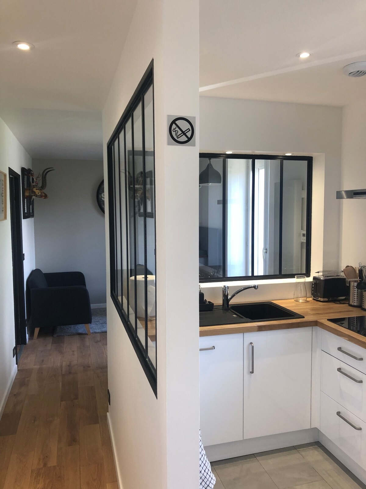 Très bel appartement, 3 pièces, entièrement rénové, Design, Place de la Bascule. Situé en bord de Loire, dans un quartier calme et à 7 min à pied du centre ancien. Résidence calme avec accès sécurisé. Appartement au 2ème étage, pouvant accueillir jusqu'à 4 personnes. Deux chambres séparées, une cuisine équipée ouverte (avec verrières) sur la SAM. Salon avec un canapé et un fauteuil. Salle de douche très spacieuse avec parquet massif en teck. Parking privatif à votre disposition.